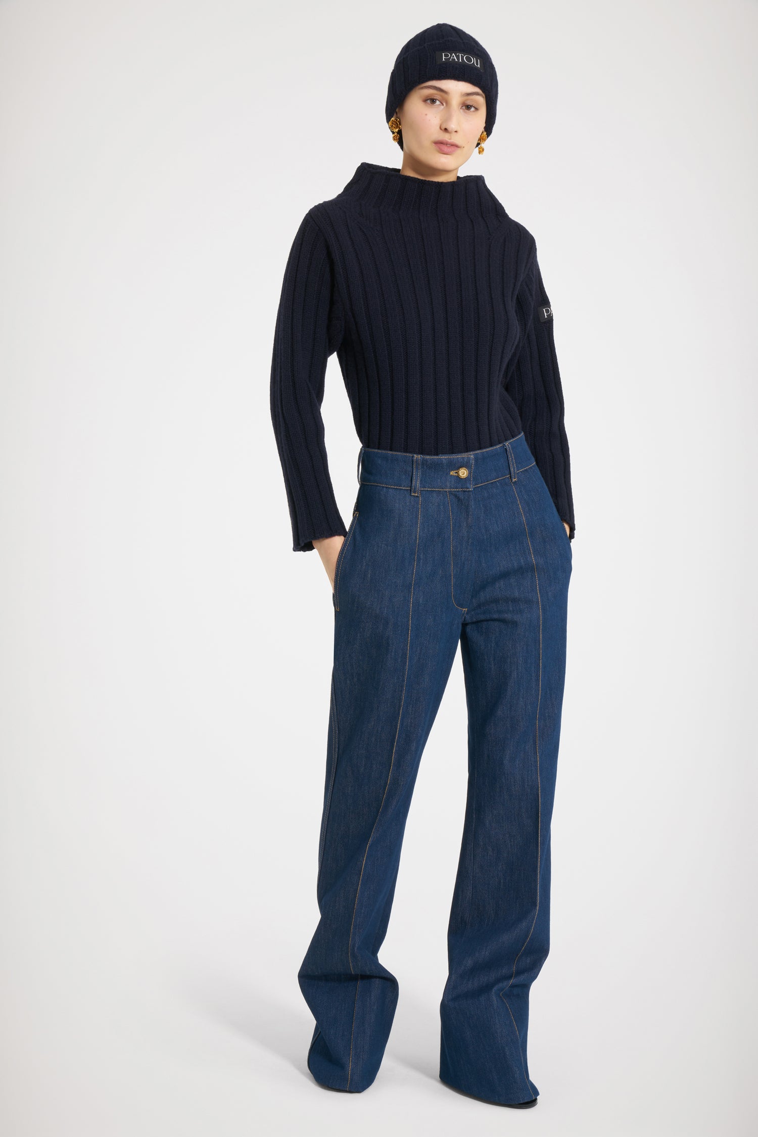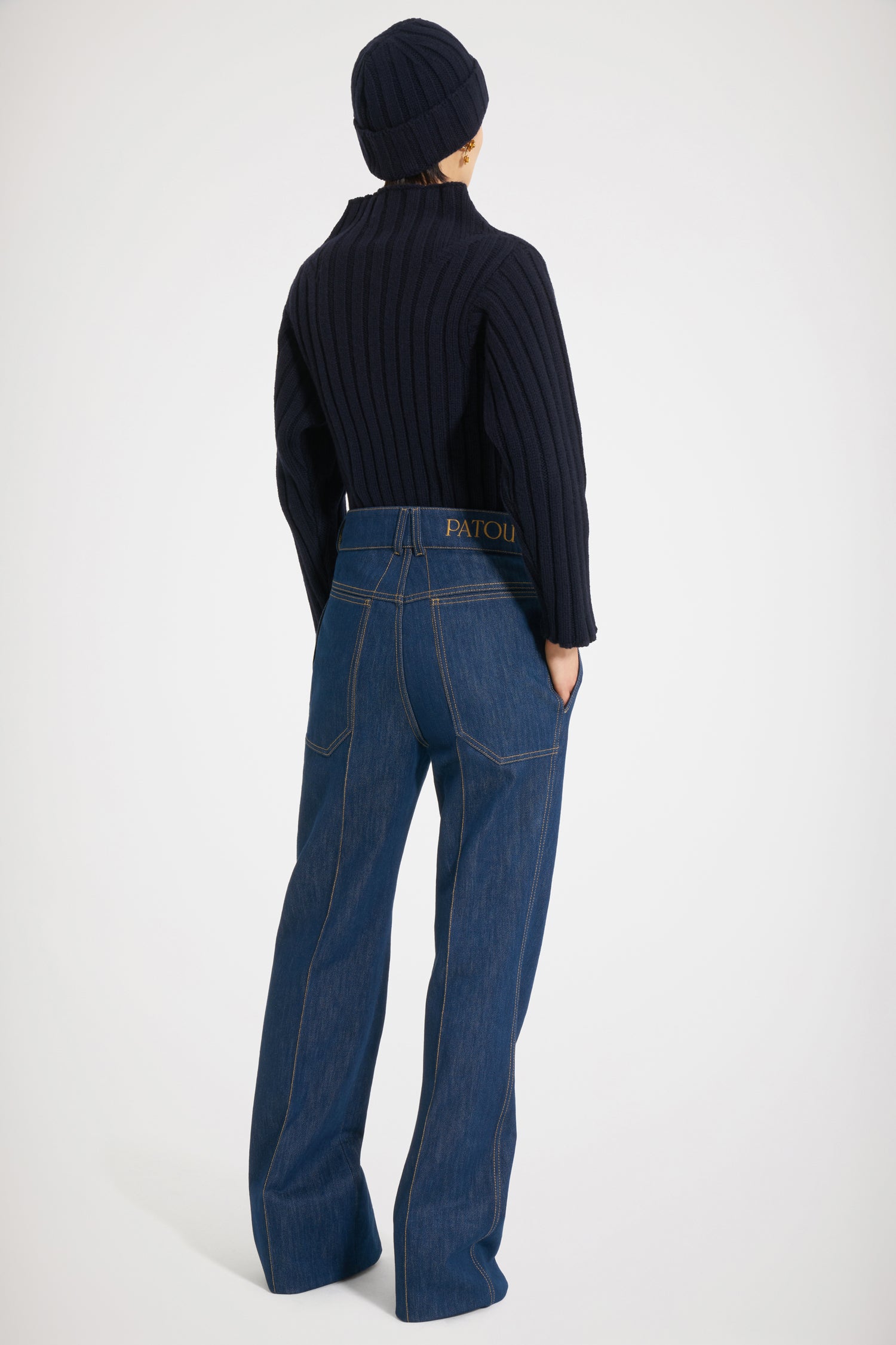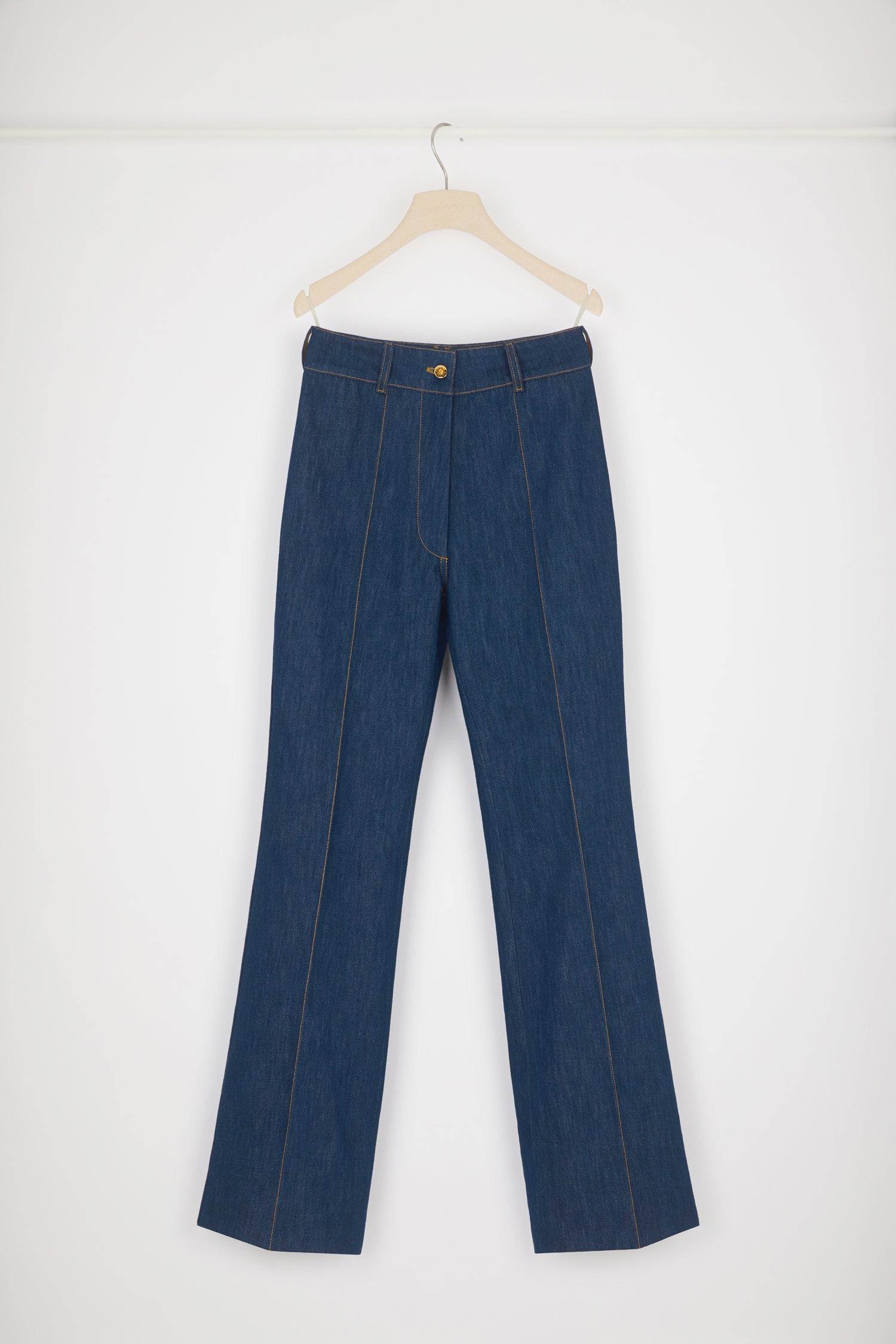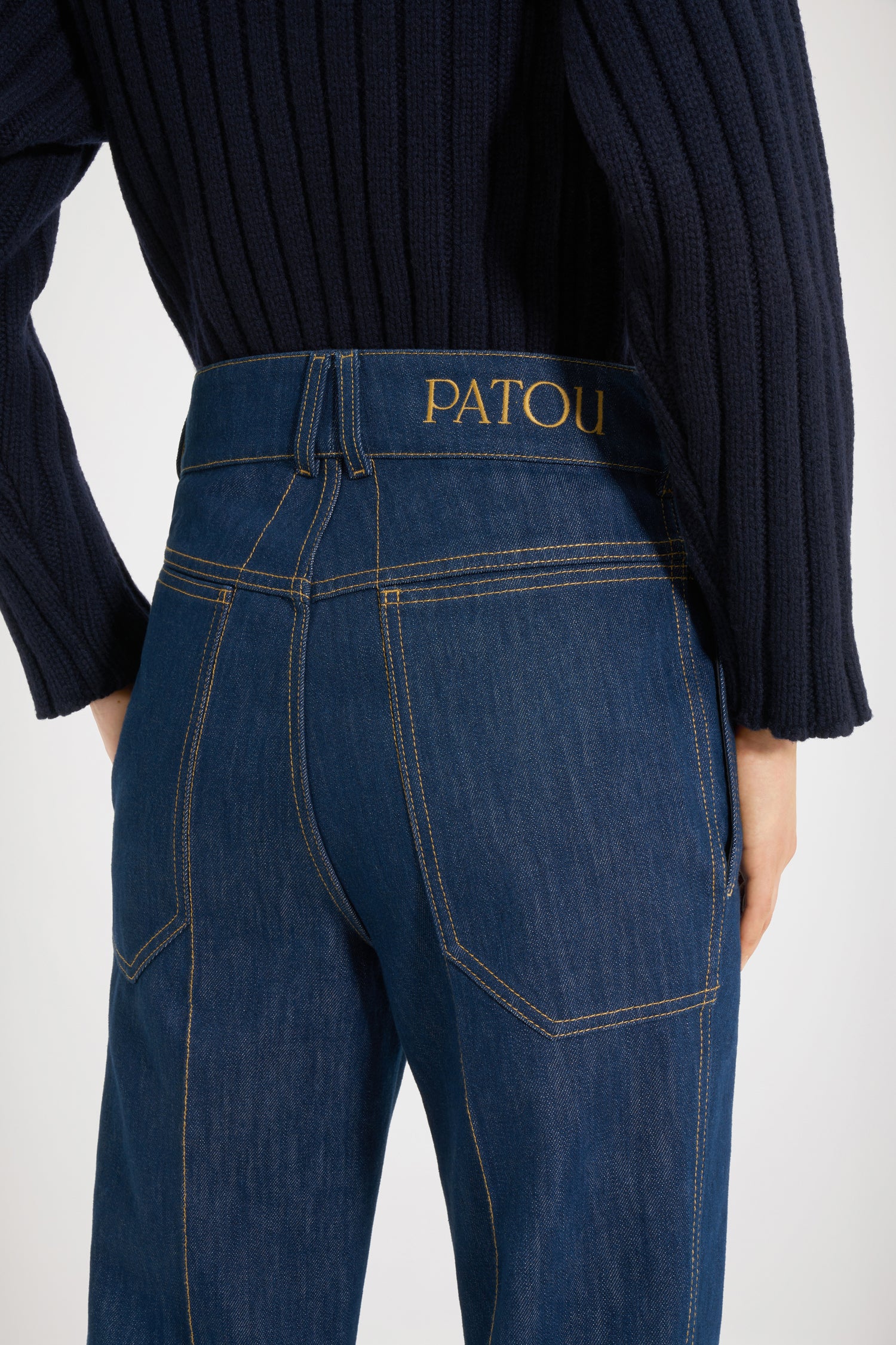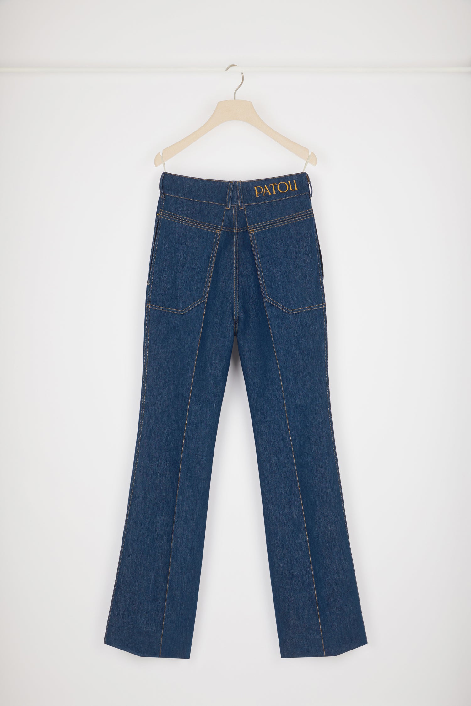 Pantalone in denim bio blu Rodeo. Gamba leggermente svasata con piega davanti e dietro. Chiusura con bottone oro. Passanti per cintura. Logo Patou ricamato sul retro. Tasche larghe sul retro per sottolineare la silhouette a ispirazione Torre Eiffel.