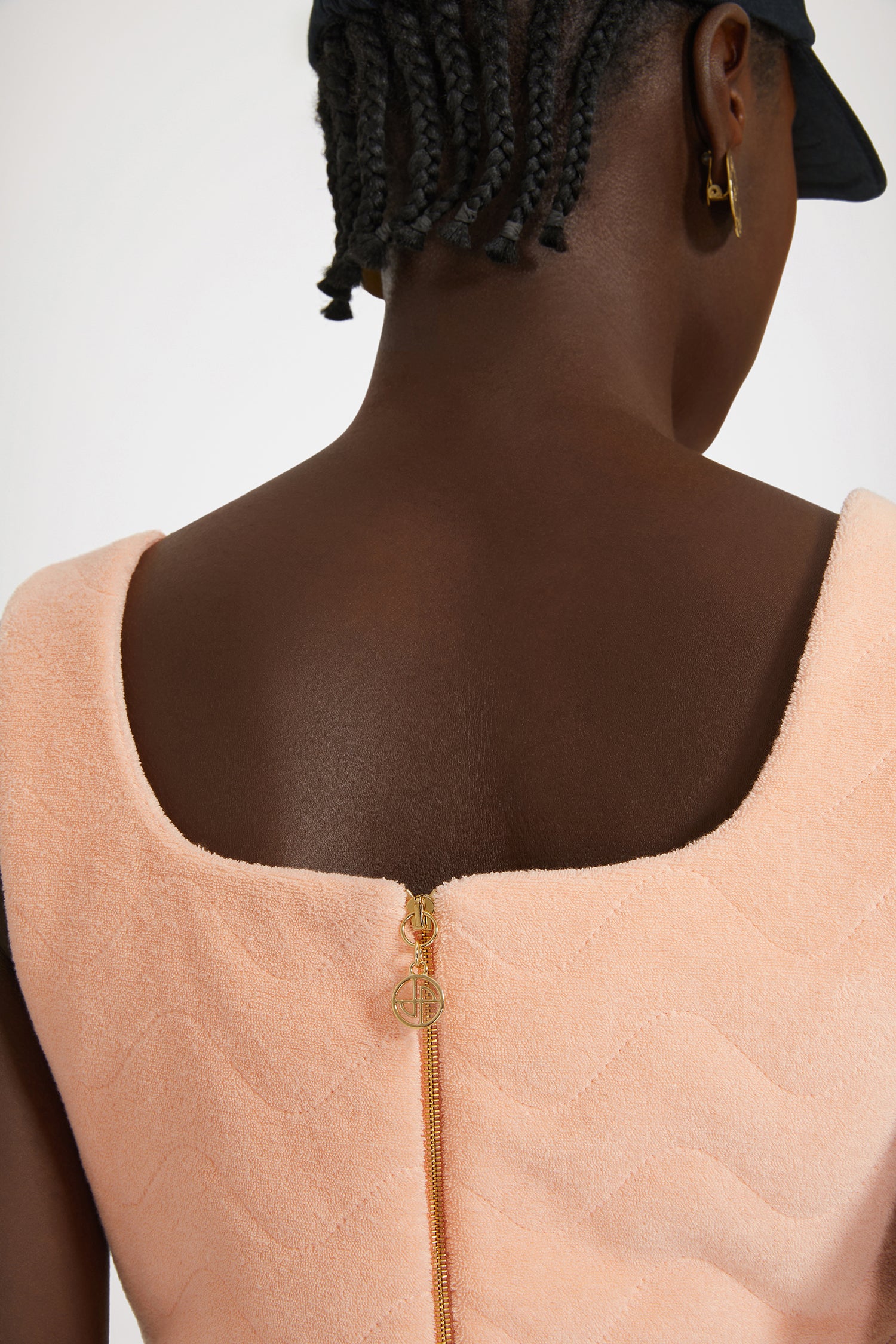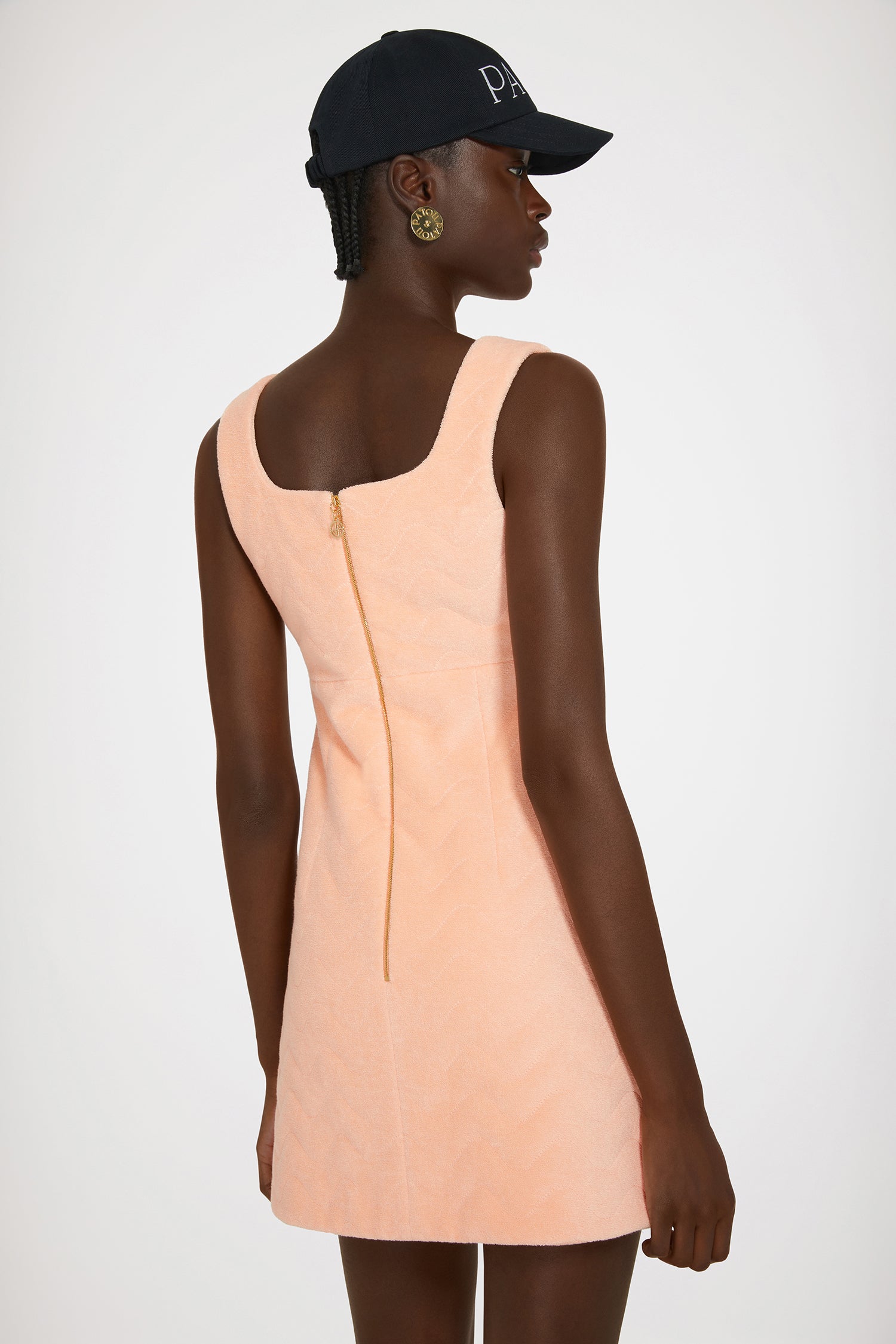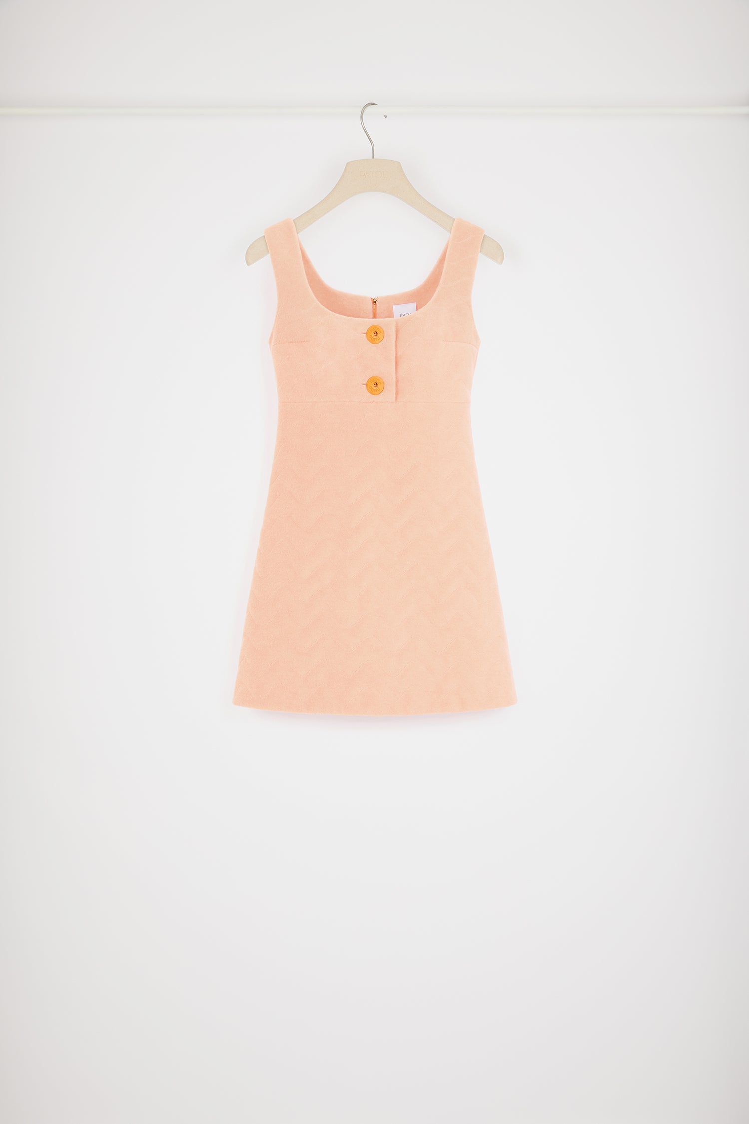 Vestito in spugna arancione albicocca. Trapuntatura a onda. Modello corto. Silhouette aderente svasata. Spalline larghe. Scollo quadrato. Bottoni oro incisi Patou sul davanti. Chiusura con zip ora sul retro con dettaglio JP iconico.