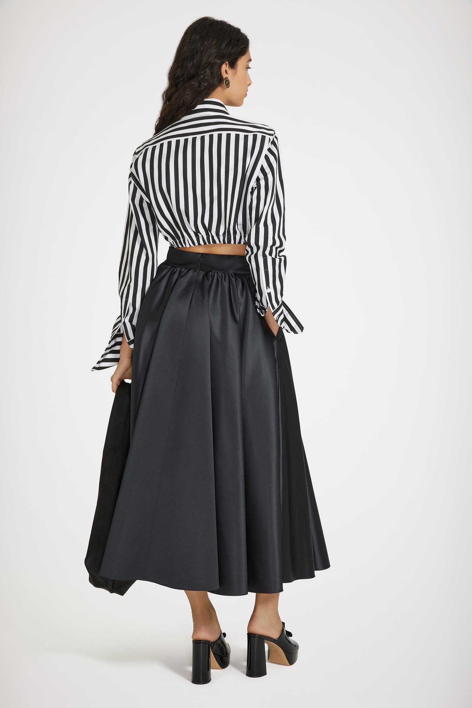 Gonna in raso duchesse nero. Vita alta. Lunghezza midi. Silhouette voluminosa. Chiusura con zip sul retro. Tasche laterali.