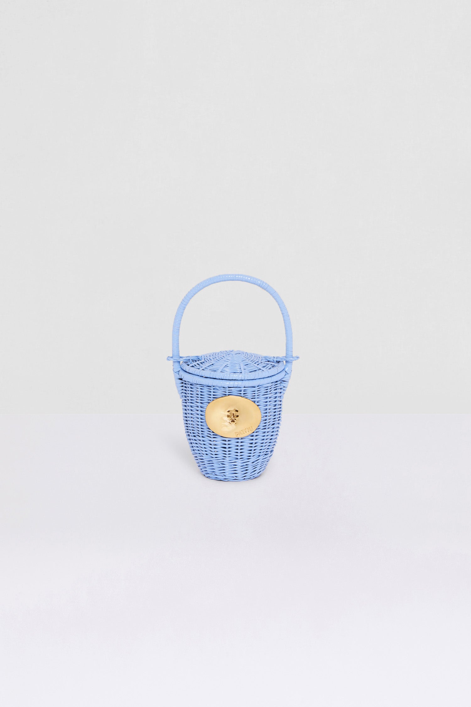 Borsa a secchiello in vimini color celeste . Maniglia con coperchio scorrevole. Decorazione oro ispirata alla Bocca della Verità.