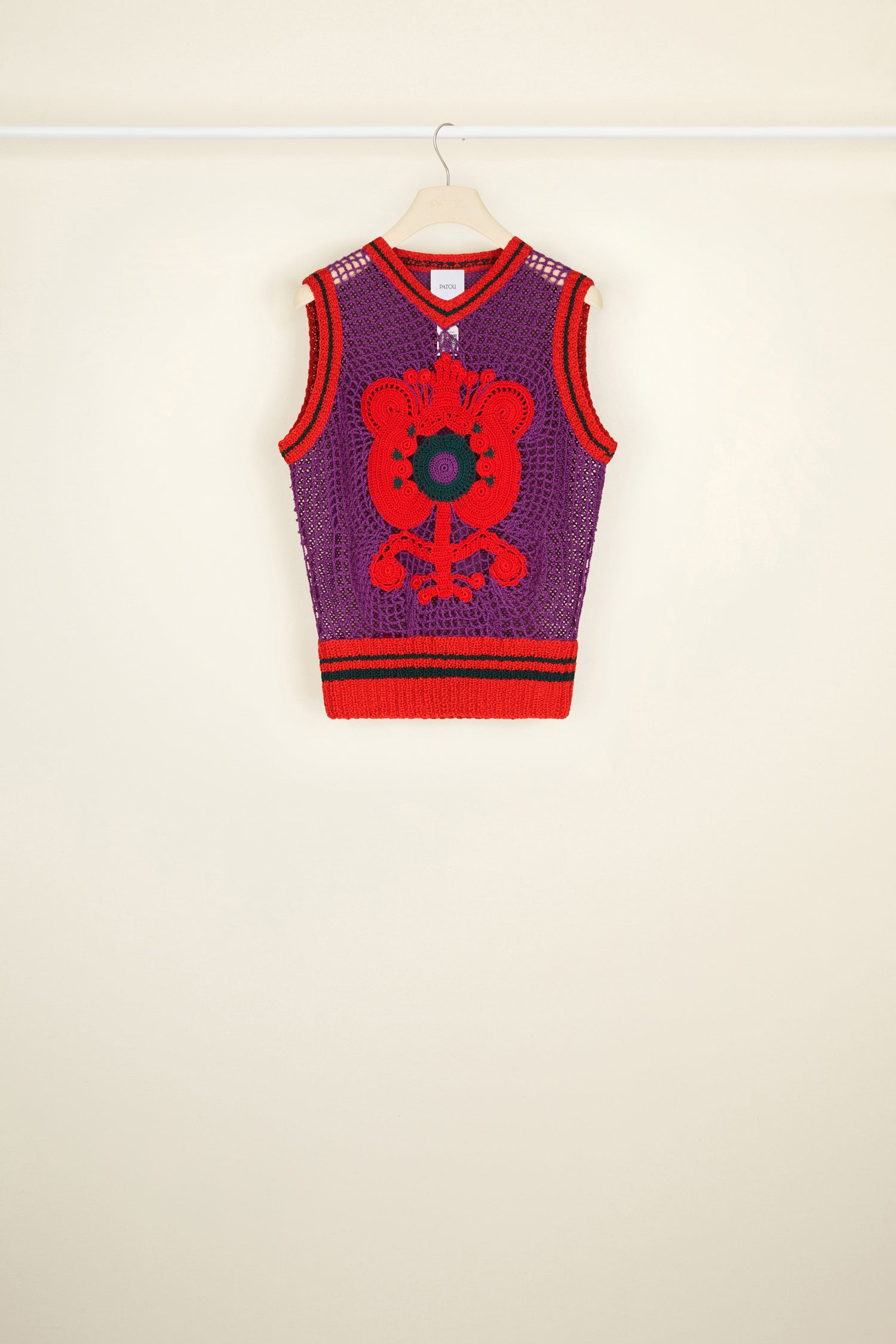 Maglione smanicato in uncinetto colore fiore di fragola. Realizzato a mano. Disegno floreale ispirato alla stampa della collezione Fantasia Botanica. Collo a V.