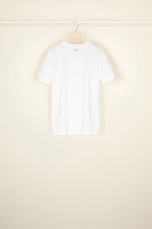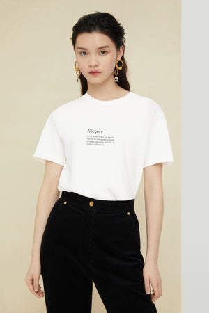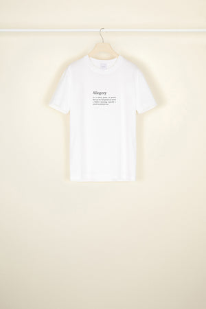 Maglietta in cotone bio bianco. Stampa in stile dizionario sul fronte, logo sul retro. Vestibilità classica, collo rotondo.