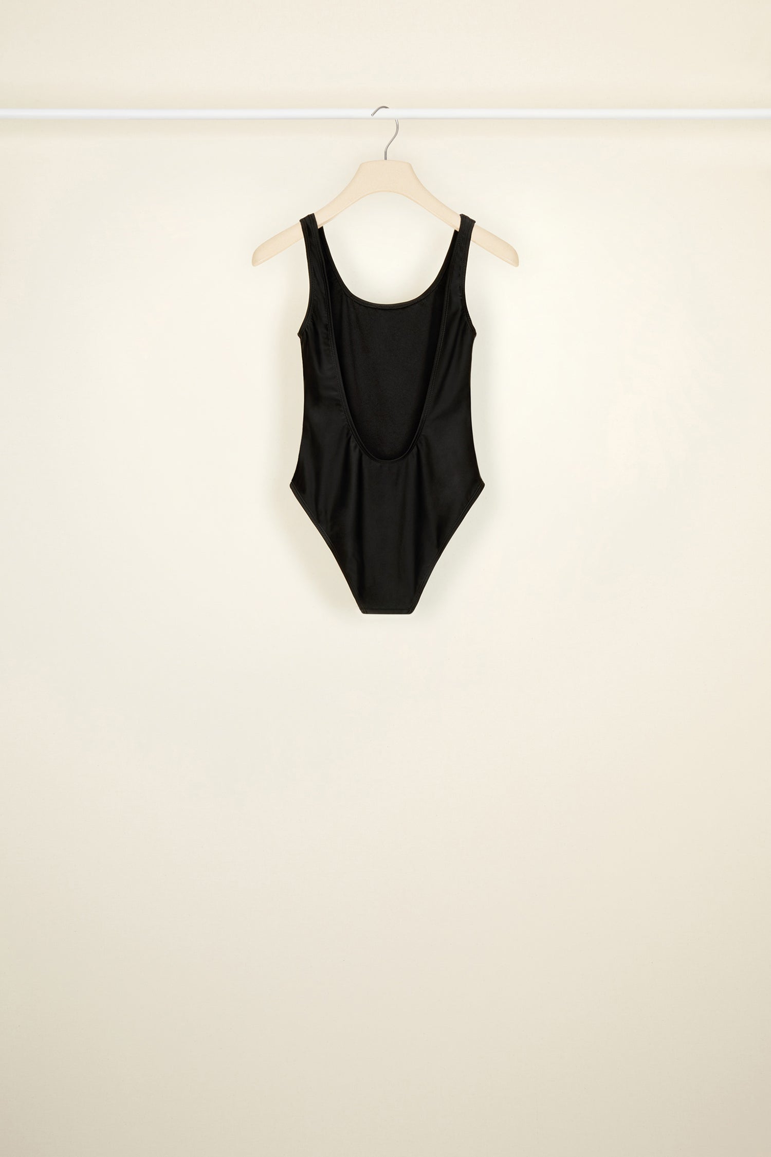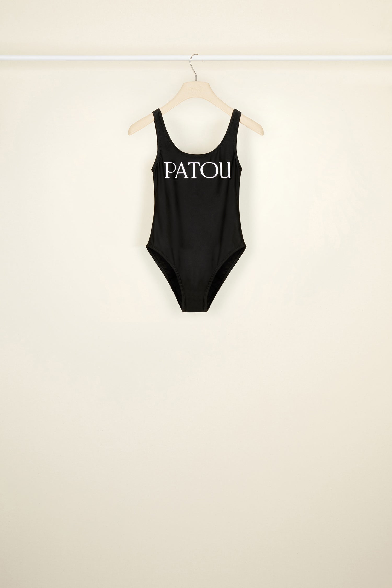Costume da bagno intero nero. Scollo tondo, schiena scoperta. Logo Patou in lettere bianche sul fronte.