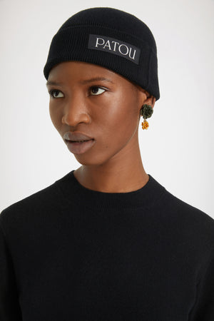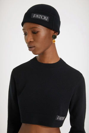 Cuffia in lana nera. Profumo a intarsio ispirato agli archivi Jean Patou.