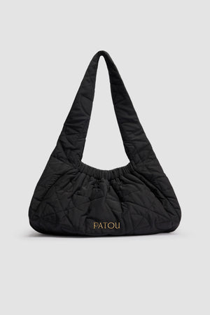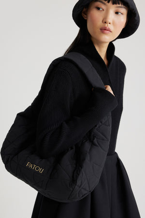 • Patou - Borsa Le Biscuit grande in raso riciclato - Black - Borsa in raso riciclato nero. Modello grande. Forma a mezzaluna con manico largo. Apertura elasticizzata. Patou in metallo oro. Fodera in cotone.