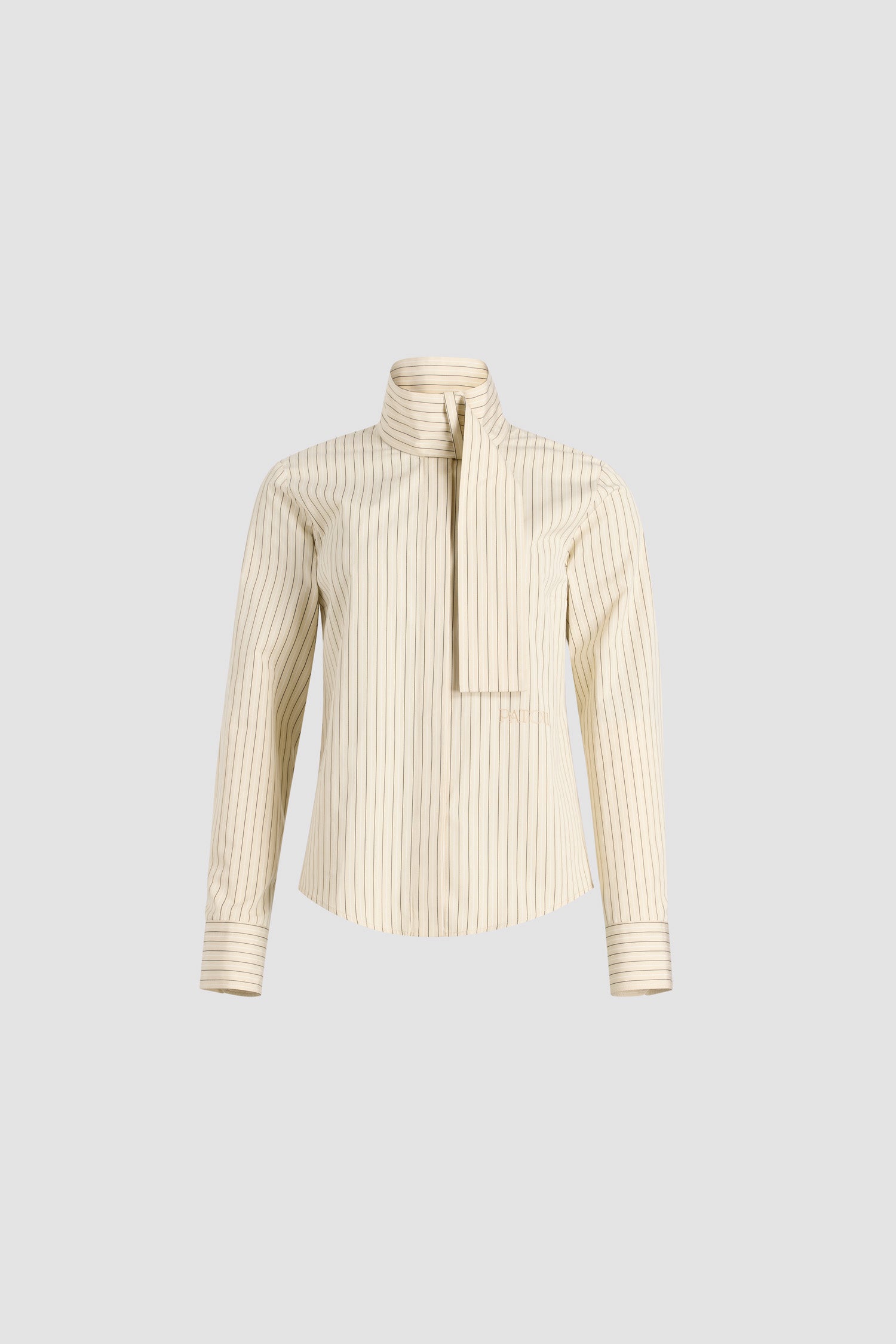 Blusa in cotone bio Snowberry White. Motivo a righe. Collo a sciarpa con passante sul davanti. Chiusura sul davanti con bottone nascosto. Polsini abbottonati. Logo Patou ricamato sul davanti.