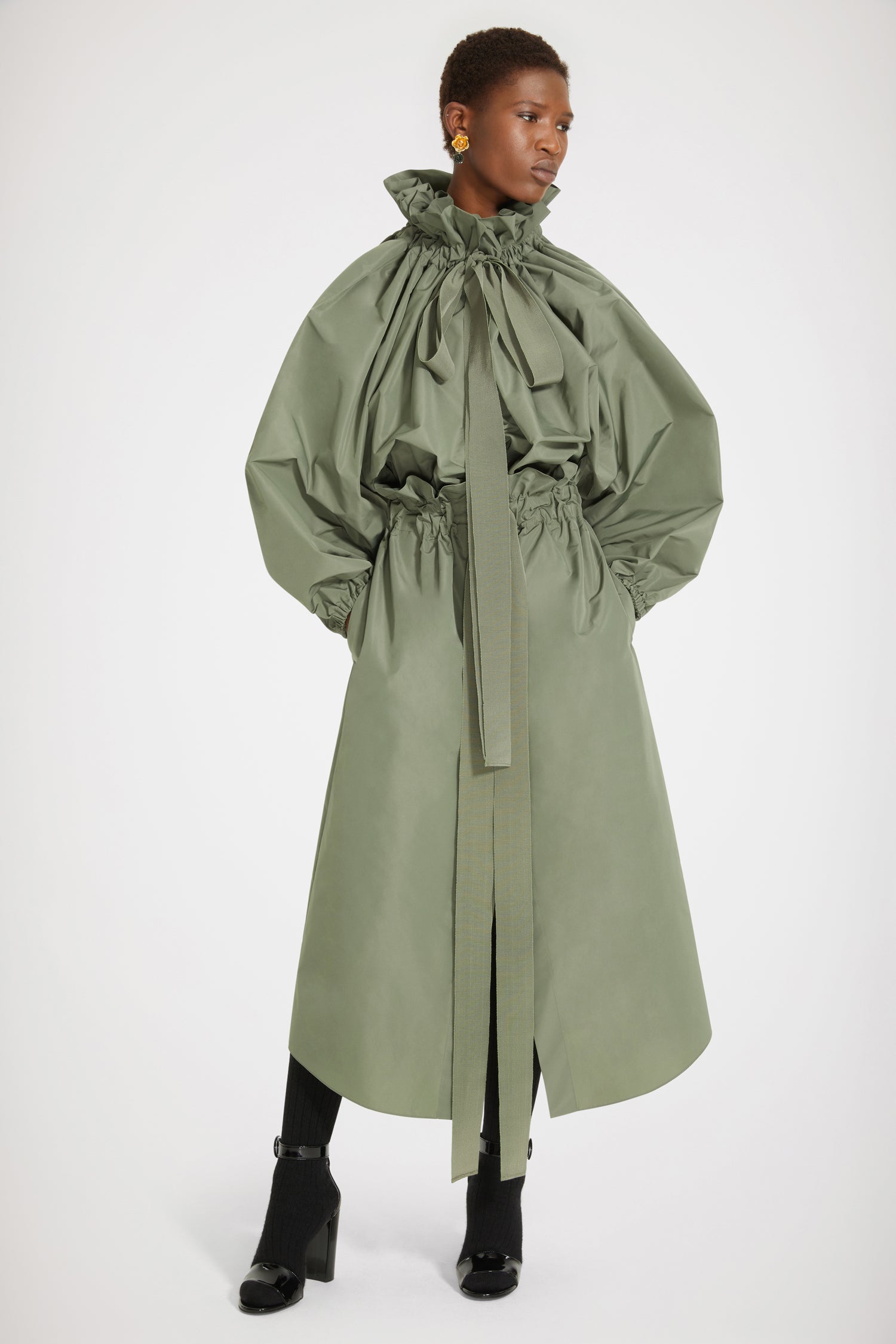 Gonna in faglia riciclata verde Loden. Vita elasticizzata con dettaglio di grosgrain. Tasche ai lati. Spacco sul davanti.