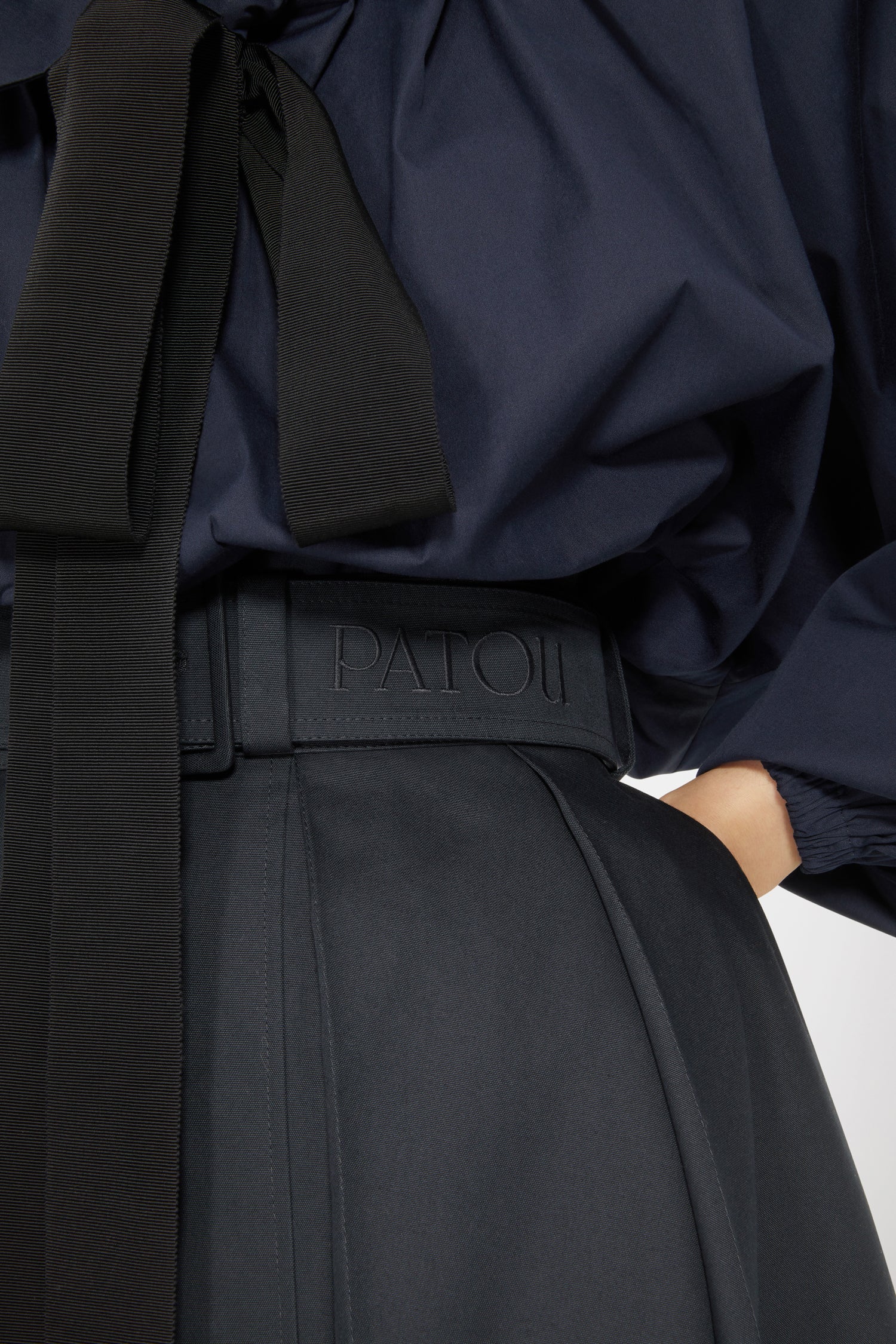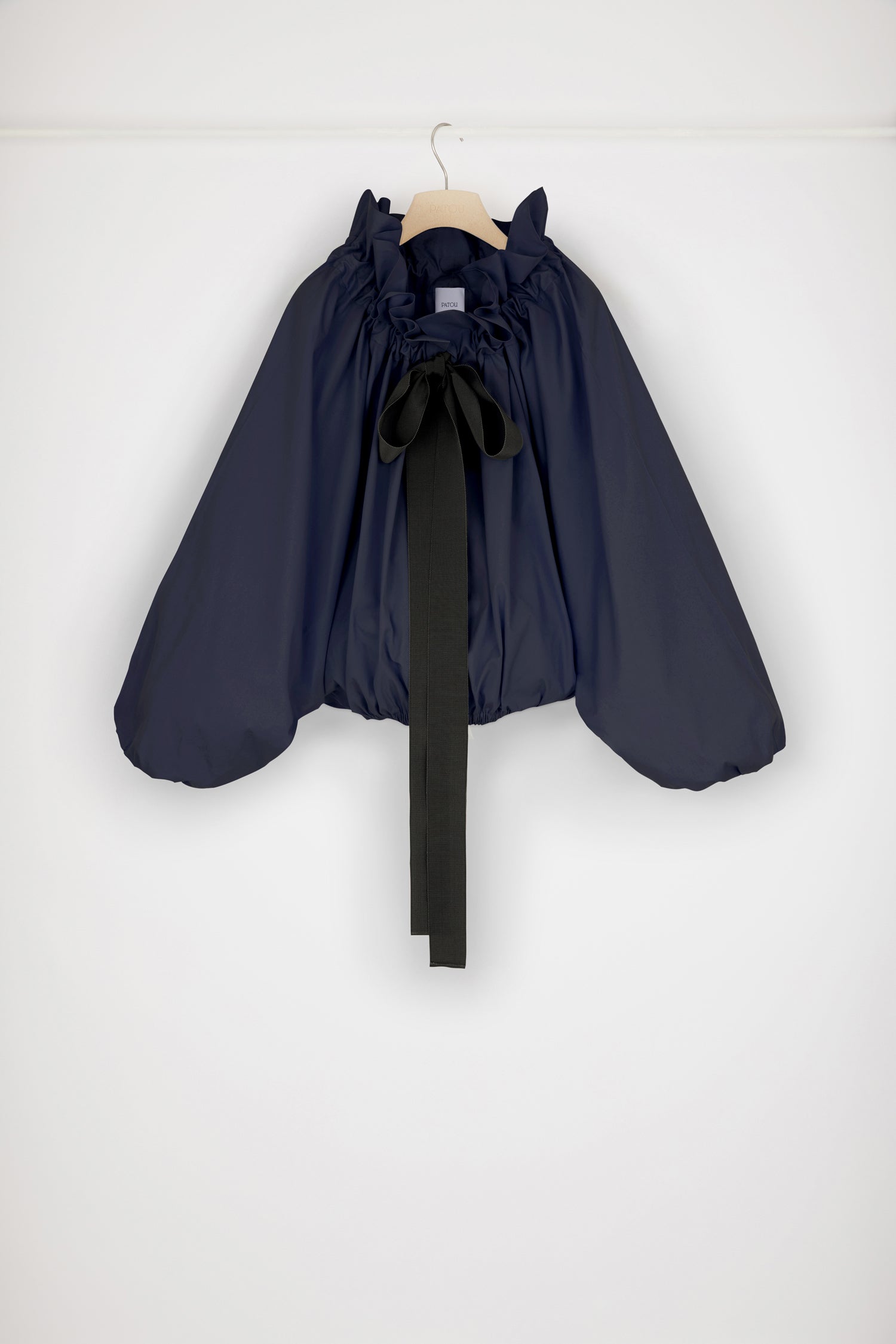 Top in cotone bio blu Notte Parigina. Vestibilità oversize. Può essere indossato chiuso sul collo o in modo da scoprire le spalle. Collo con dettaglio di balza sul fronte e coulisse in grosgrain. Maniche a pipistrello con polsini elasticizzati. Vita elasticizzata.