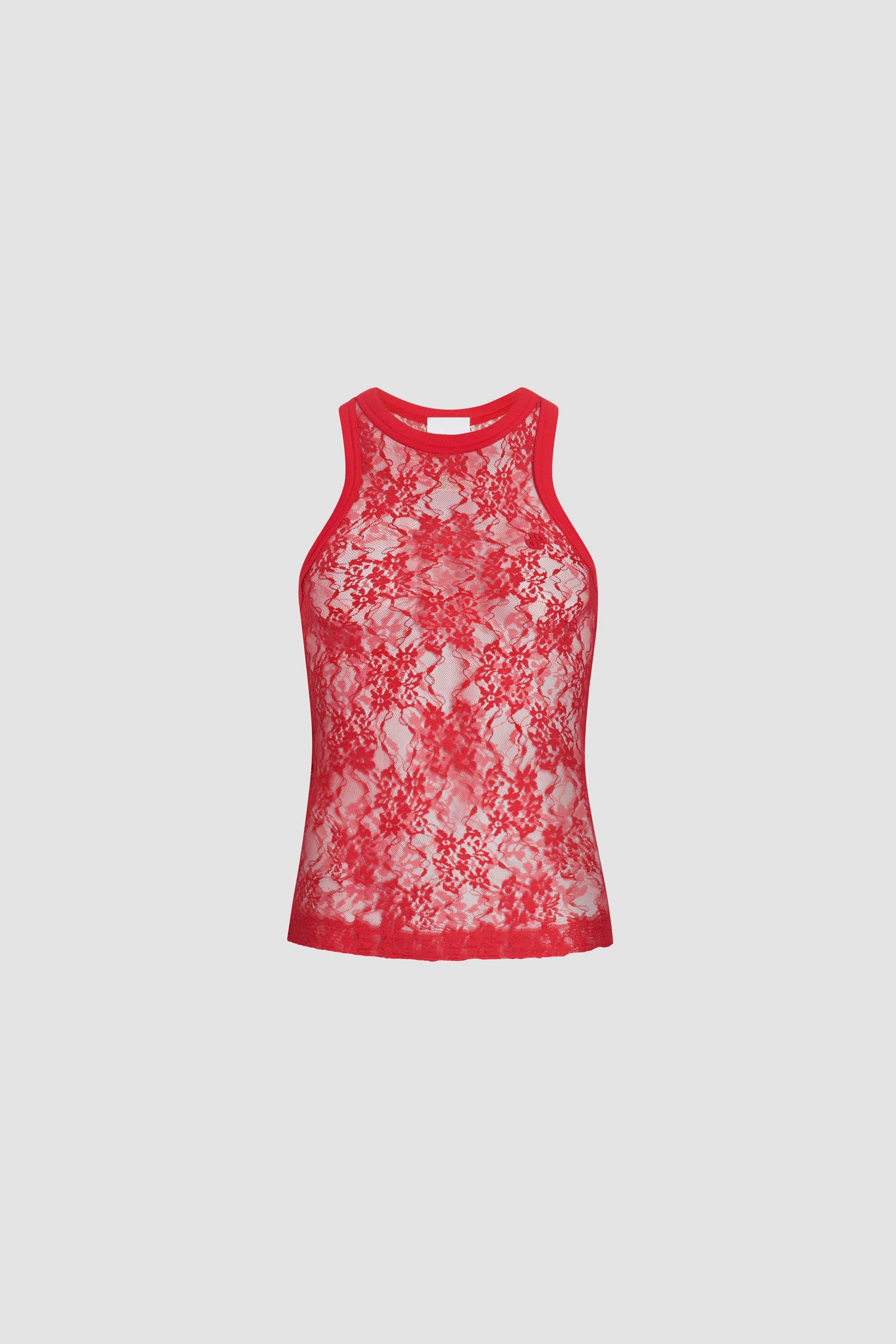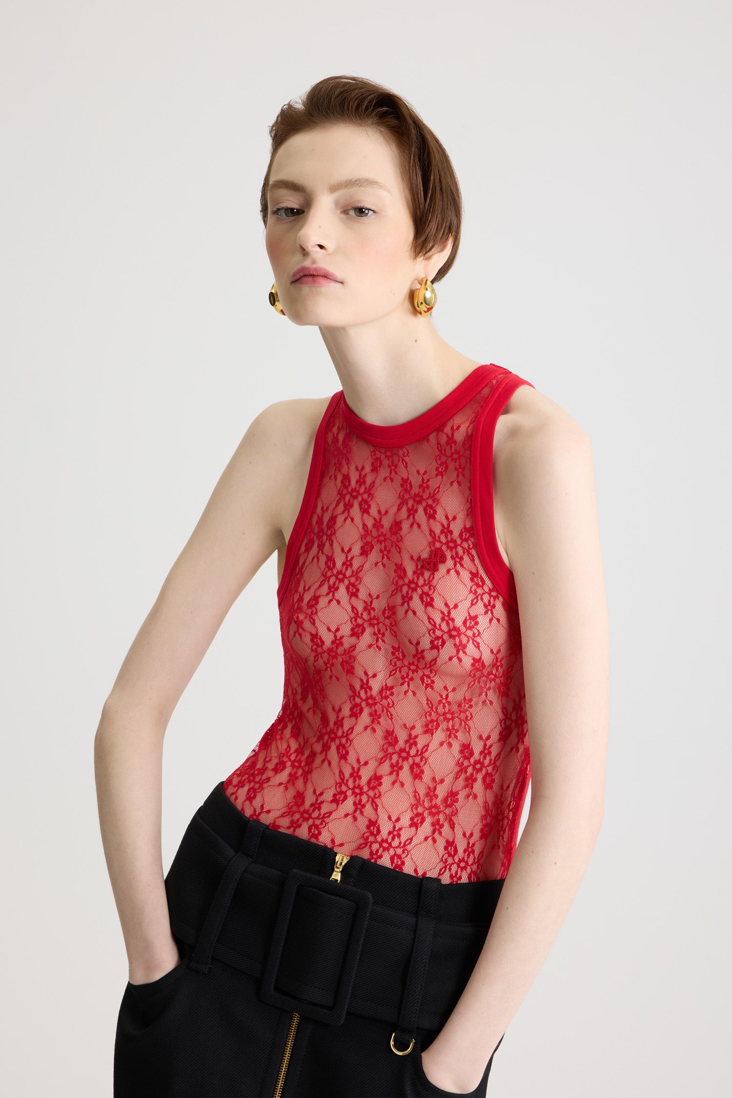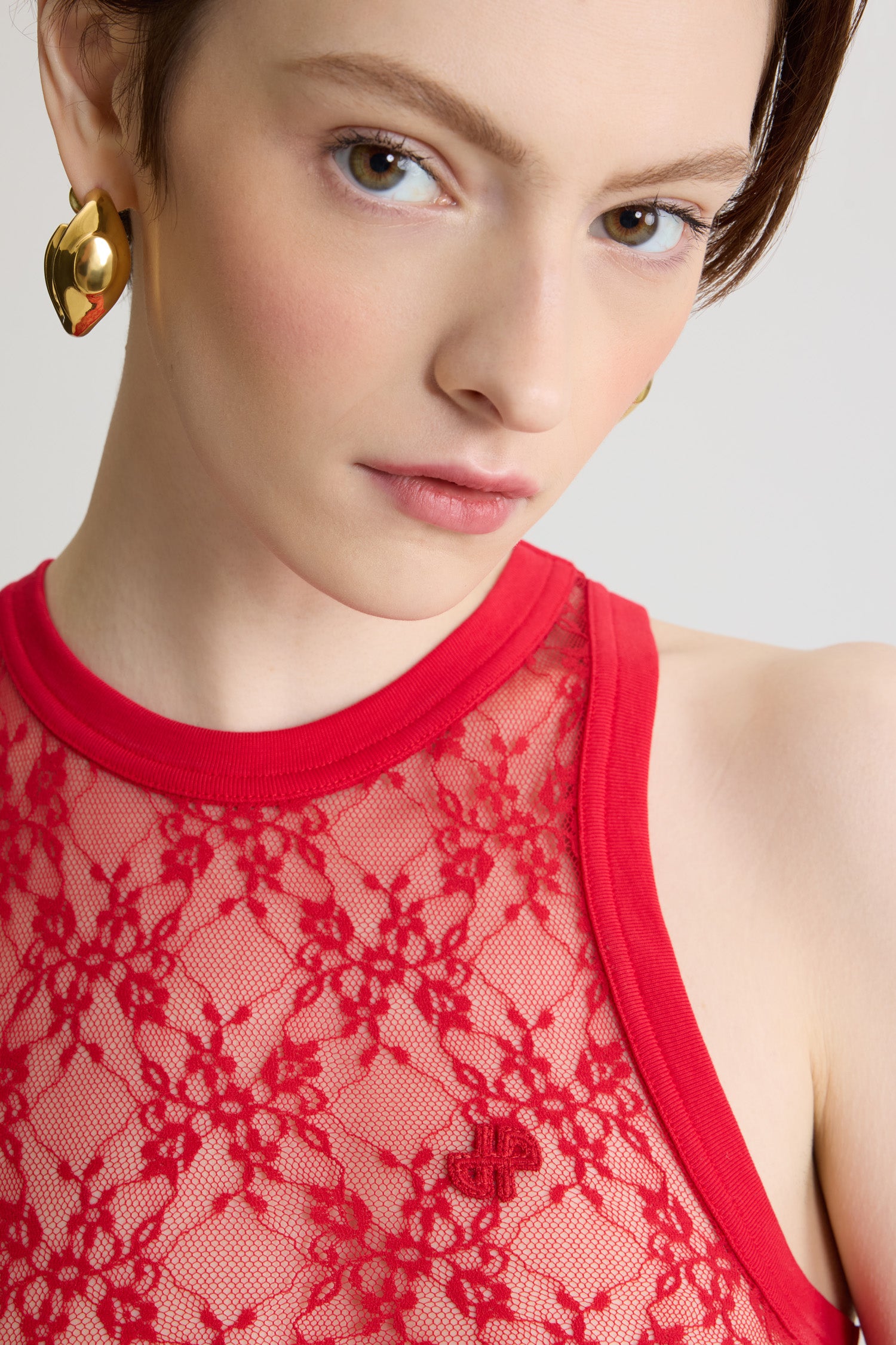 Canotta in jersey di pizzo Babylone Red. Modello aderente. Collo e giromanica a costine.