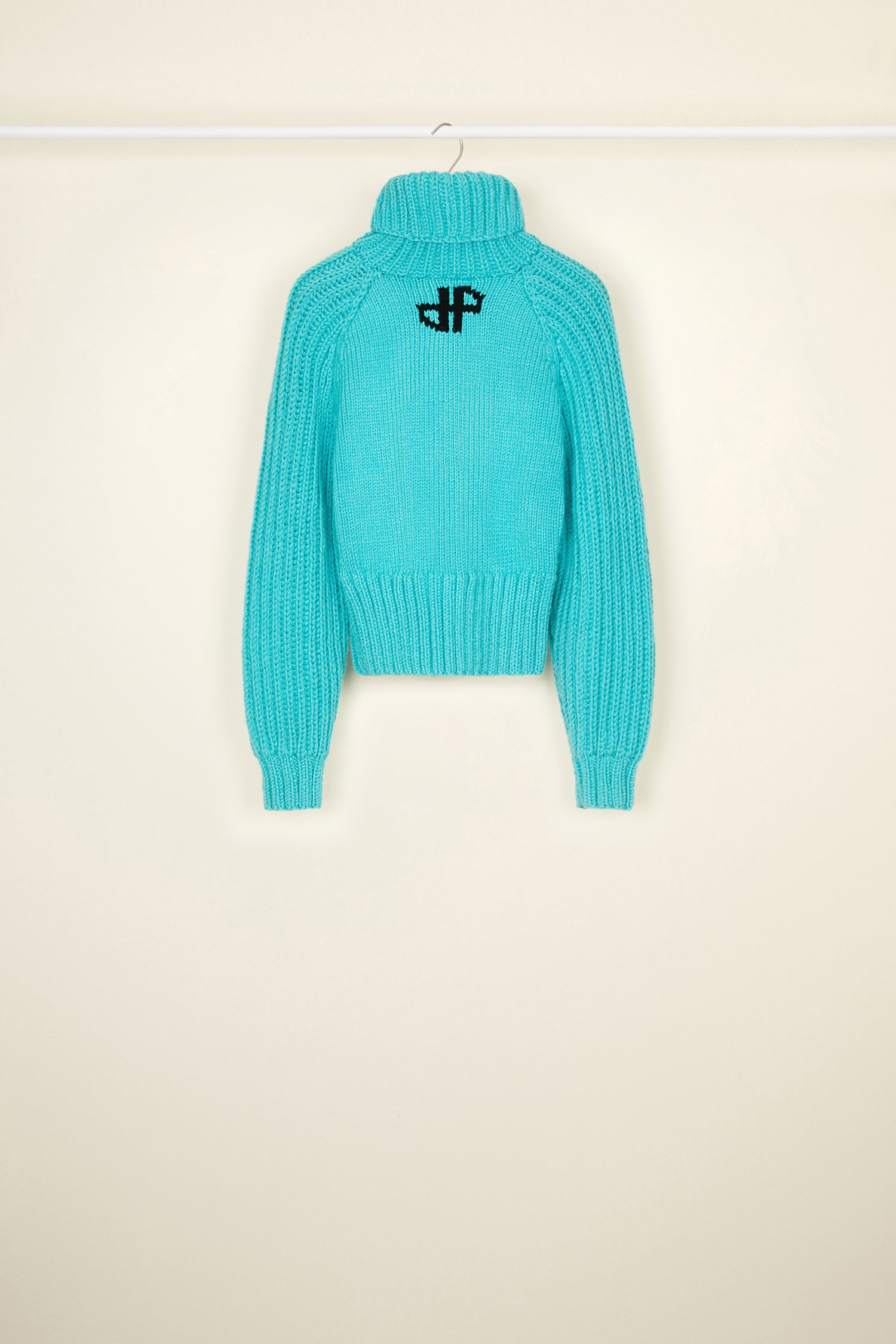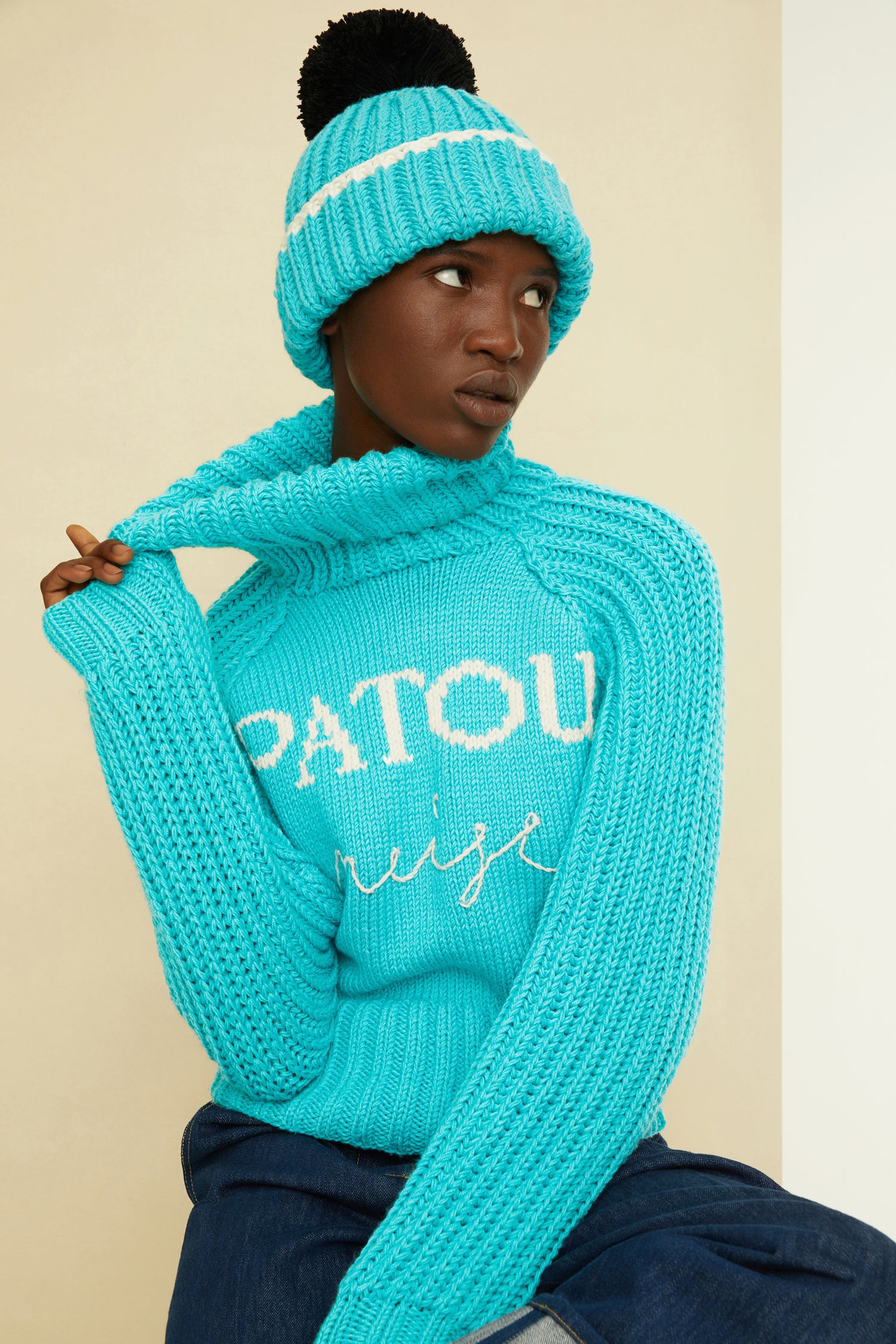 Maglione in lana vergine blu. Modello della collezione Patou Neige. Fatto a mano con tecniche miste. Silhouette corta e aderente. Collo alto. Maniche voluminose. Logo Patou Neige bianco.