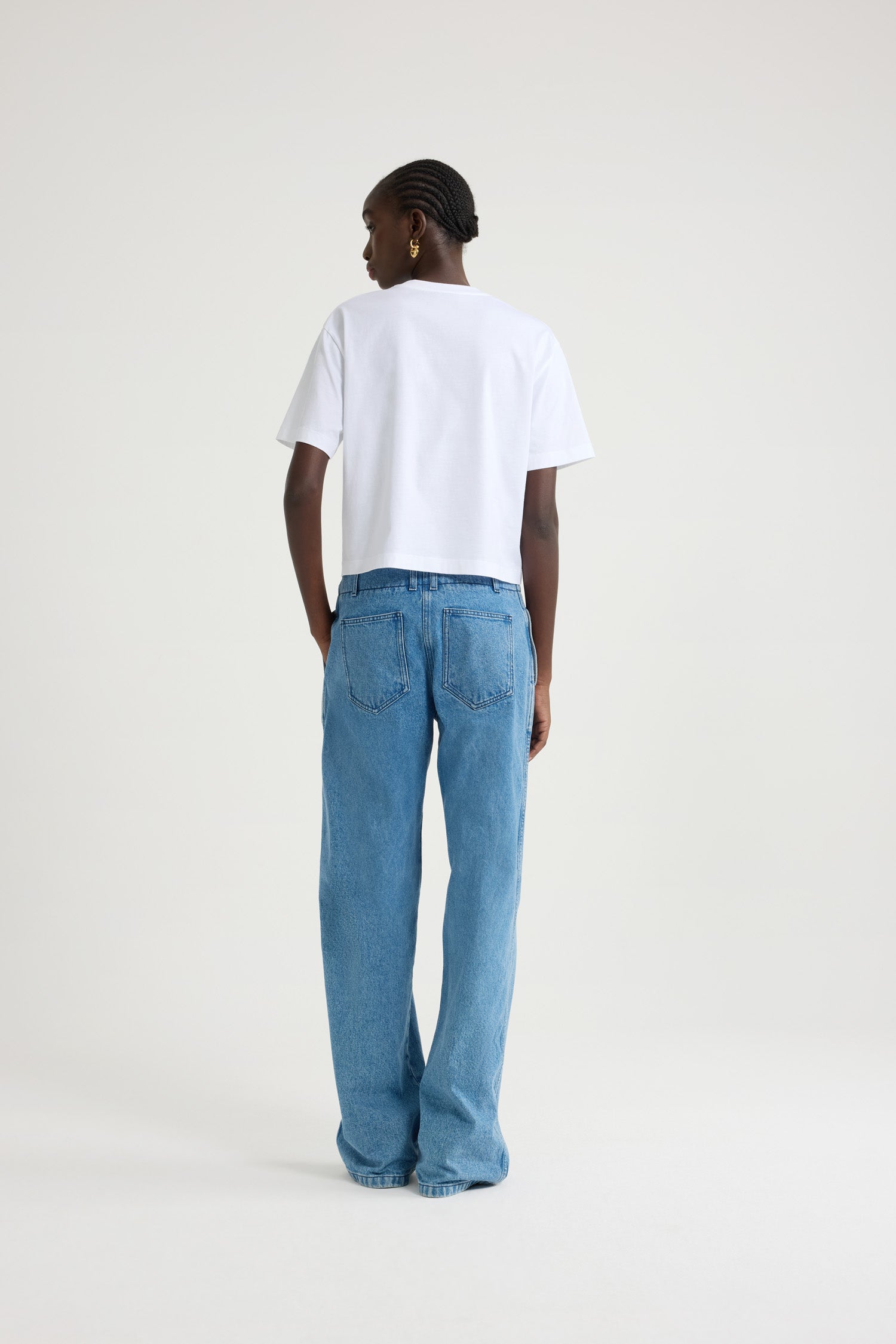 ホワイトのオーガニックコットン製Tシャツ。レギュラーフィット。ややクロップド丈。パトゥロゴ刺繍入りのクルーネック。