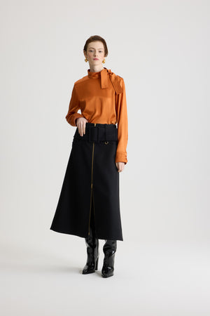 ゴールデンオークのオーガニックシルクサテン製トップス。スカーフディテール付きのハイネック。肩にボタン。袖口にボタン付き。