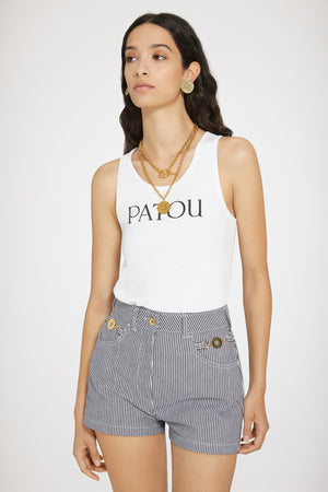 ネイビーのコットンデニムショートパンツ。細めのストライプ。ハイウエスト。ミニ丈。フロントにゴールドトーンのパトゥ刻印入りメダリオン装飾。フロントにゴールドトーンのパトゥ刻印入りボタン。ベルトループ付き。サイドにポケット。ウエストにパトゥの刺繍。バックにVシーム。