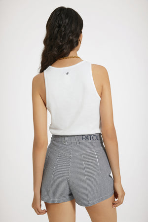 • Patou - プリントコットンデニム ミニショートパンツ - Navy Striped - ミニなのに存在感たっぷり。ネイビーのコットンデニムショートパンツ。細めのストライプ。ハイウエスト。ミニ丈。フロントにゴールドトーンのパトゥ刻印入りメダリオン装飾。フロントにゴールドトーンのパトゥ刻印入りボタン。ベルトループ付き。サイドにポケット。ウエストにパトゥの刺繍。バックにVシーム。
