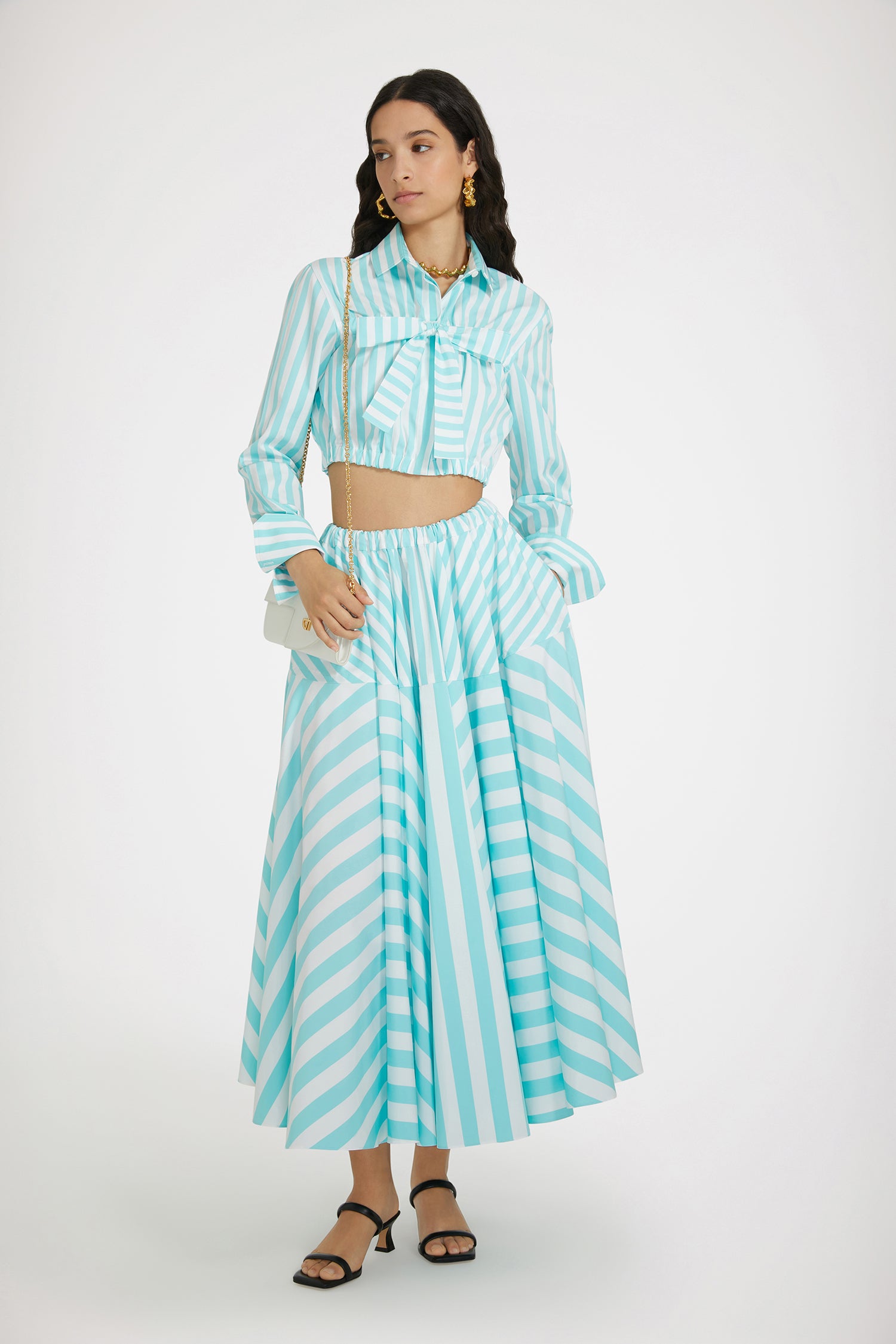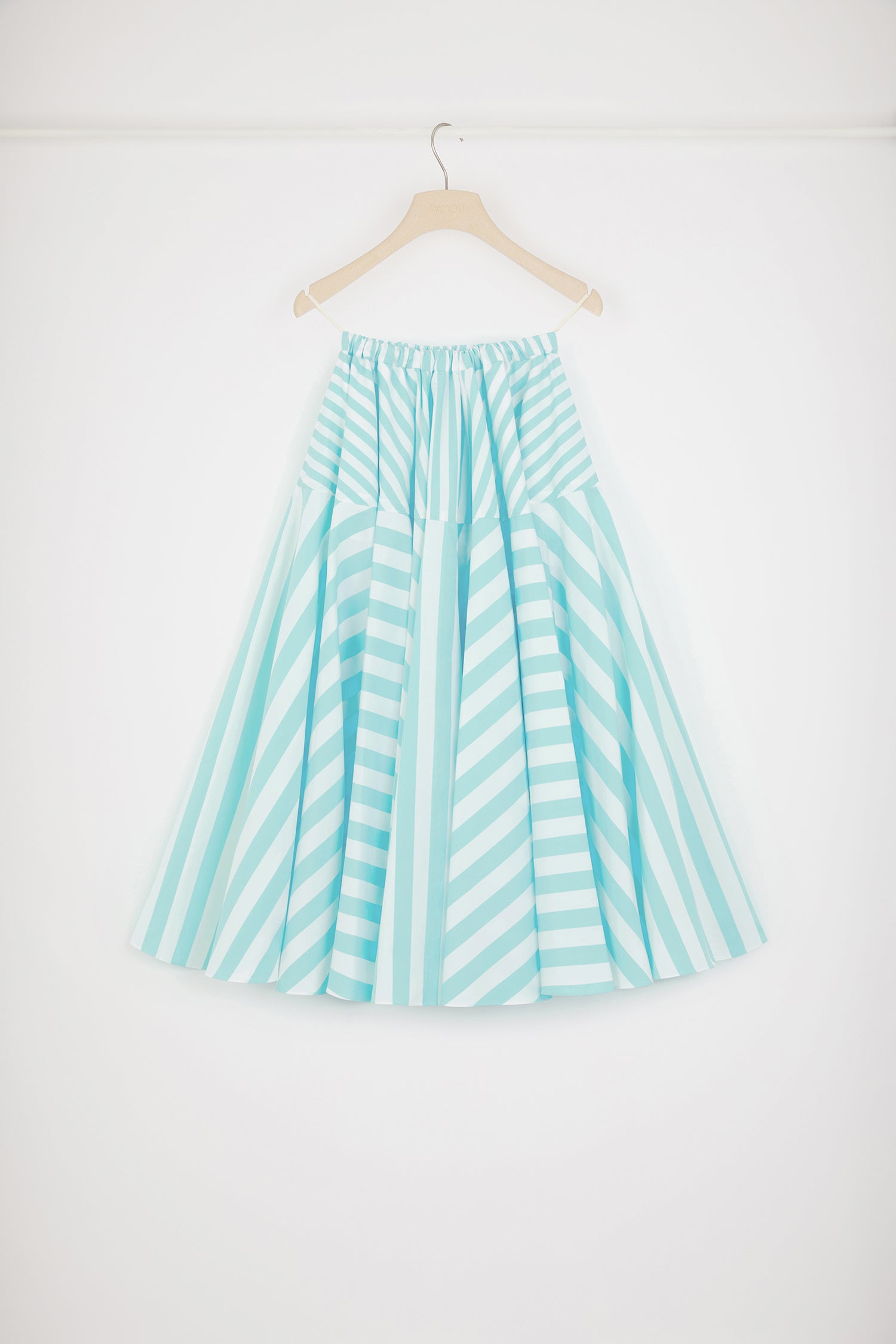 グリーン&ホワイトのコットンポプリン製スカート。ミックスストライプ。ハイウエスト。マキシ丈。フルボリューム。伸縮性があるウエスト。シームポケット。
