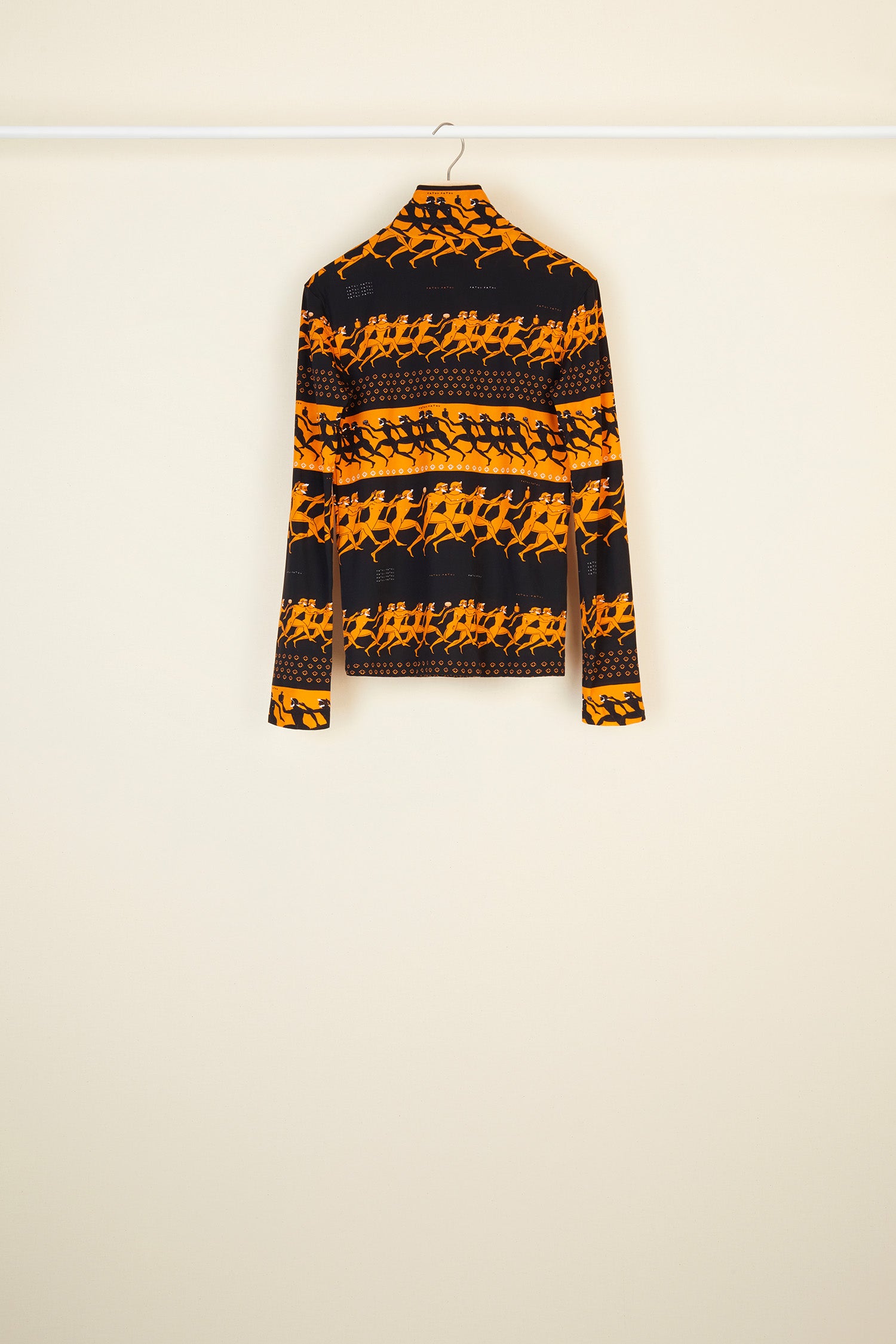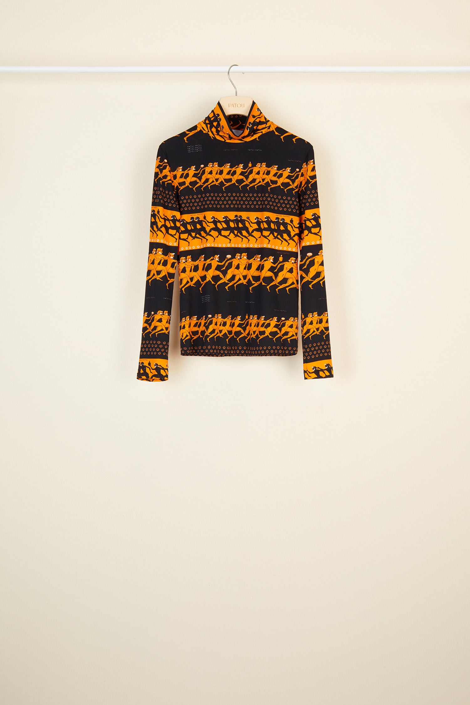 プリント入りジャージートップ、パトゥを象徴する要素を取り入れた古代ギリシャ風モチーフ。ハイカラー、ロングスリーブ。