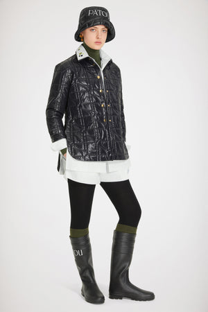 ブラックのリサイクルポリアミド製シャツ。全体にJPキルティング。バックが長めのアシンメトリカルなシルエット。フロントとカフスにゴールドトーンのスタッドボタン付き。ややクロップドスリーブ。