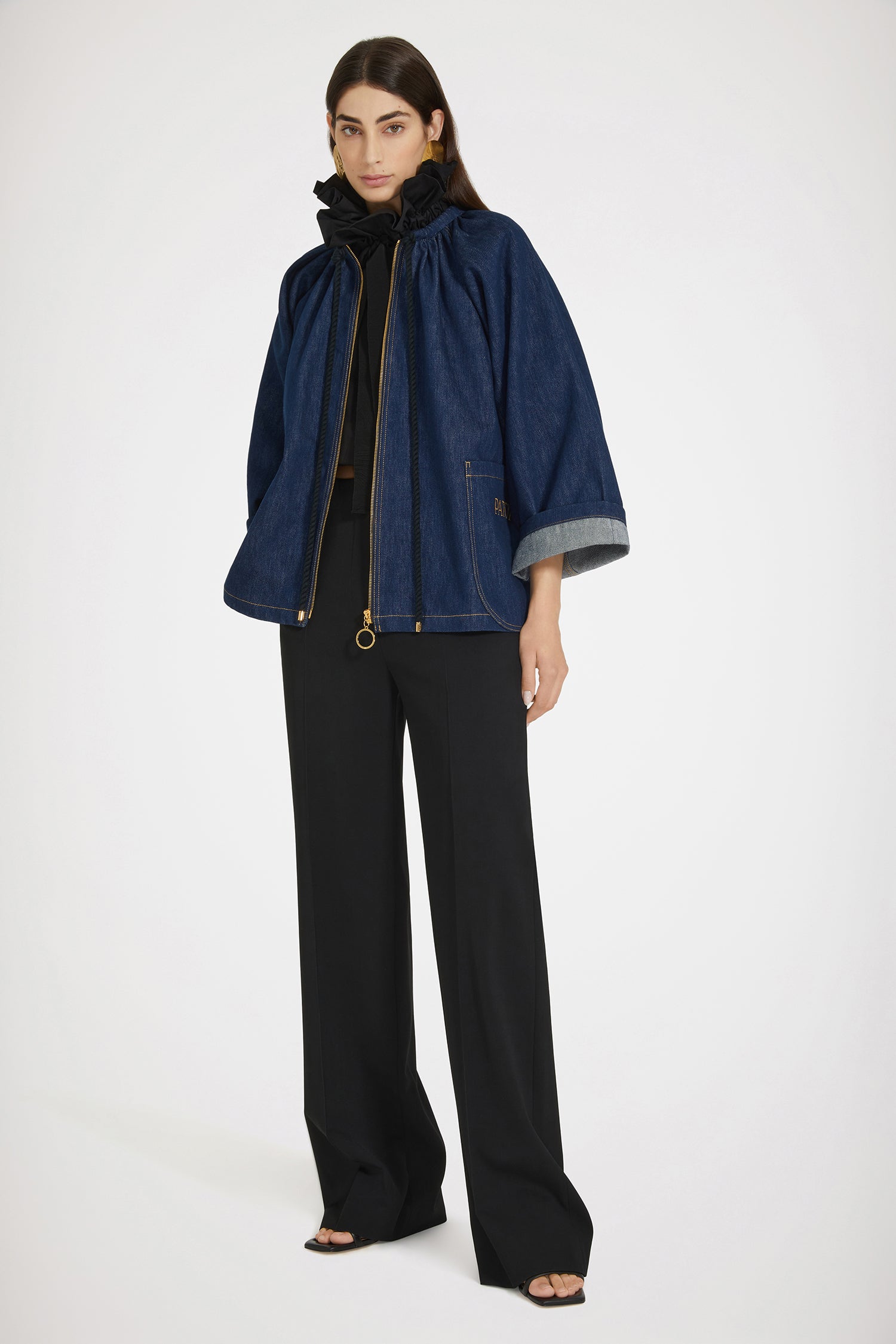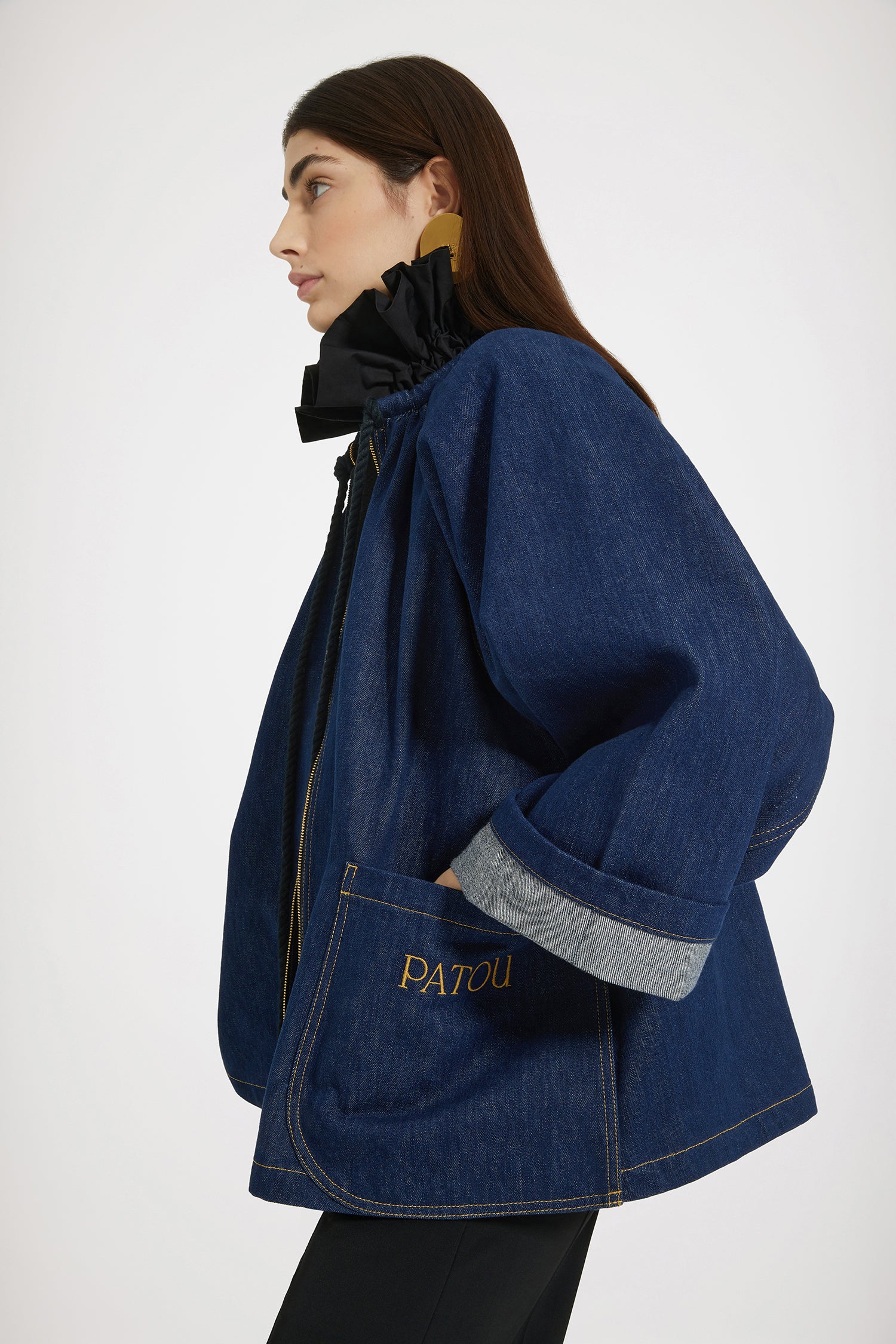 ロデオブルーのコットンデニム製ジャケット。大きめのシルエット。ギャザーネック、編み込みのロープドローストリングにゴールドトーンのPatouエングレーブ入りの先端チップ付き。ファスナー。大きなパッチポケット。前面にPatou刺繍。