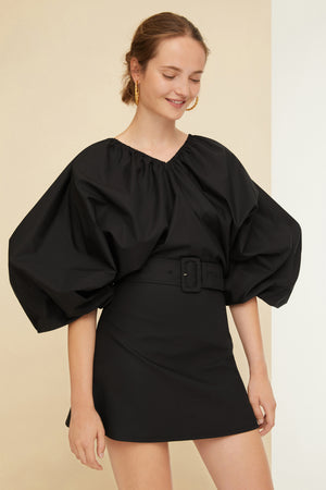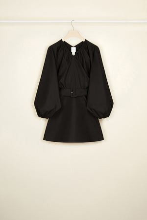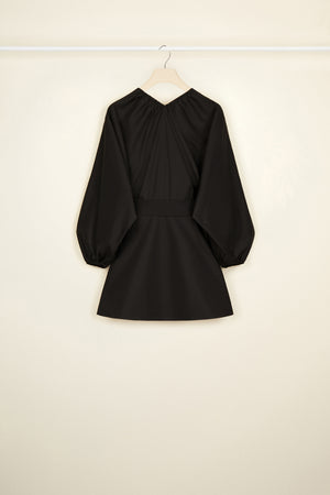ブラックのオーガニックコットンポプリン製ドレス。ショート丈。伸縮性のあるVネックラインとバック。ハイボリュームのスリーブ、伸縮性のある袖口。ウエストに調節可能な布製のワイドベルトに、共布のくるみバックルとトーン オン トーン刺繍のパトゥロゴを添えました。Aラインスカート。