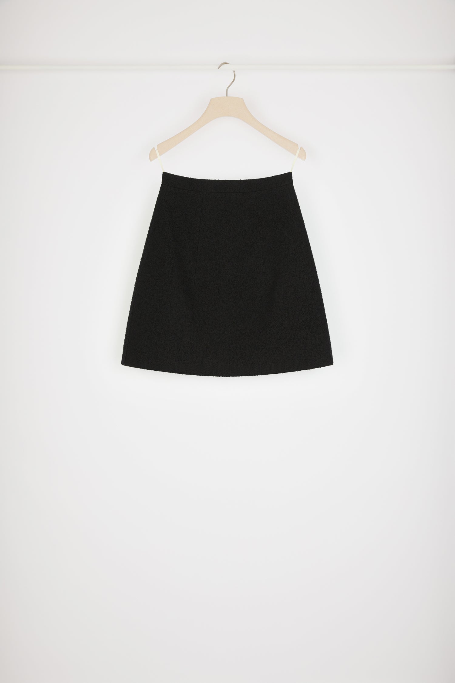 ブラックカラーのコットン混紡ツイード製スカート。ショート丈。Aラインシルエット。フロントとバックにダーツ。バックに開閉ファスナー。