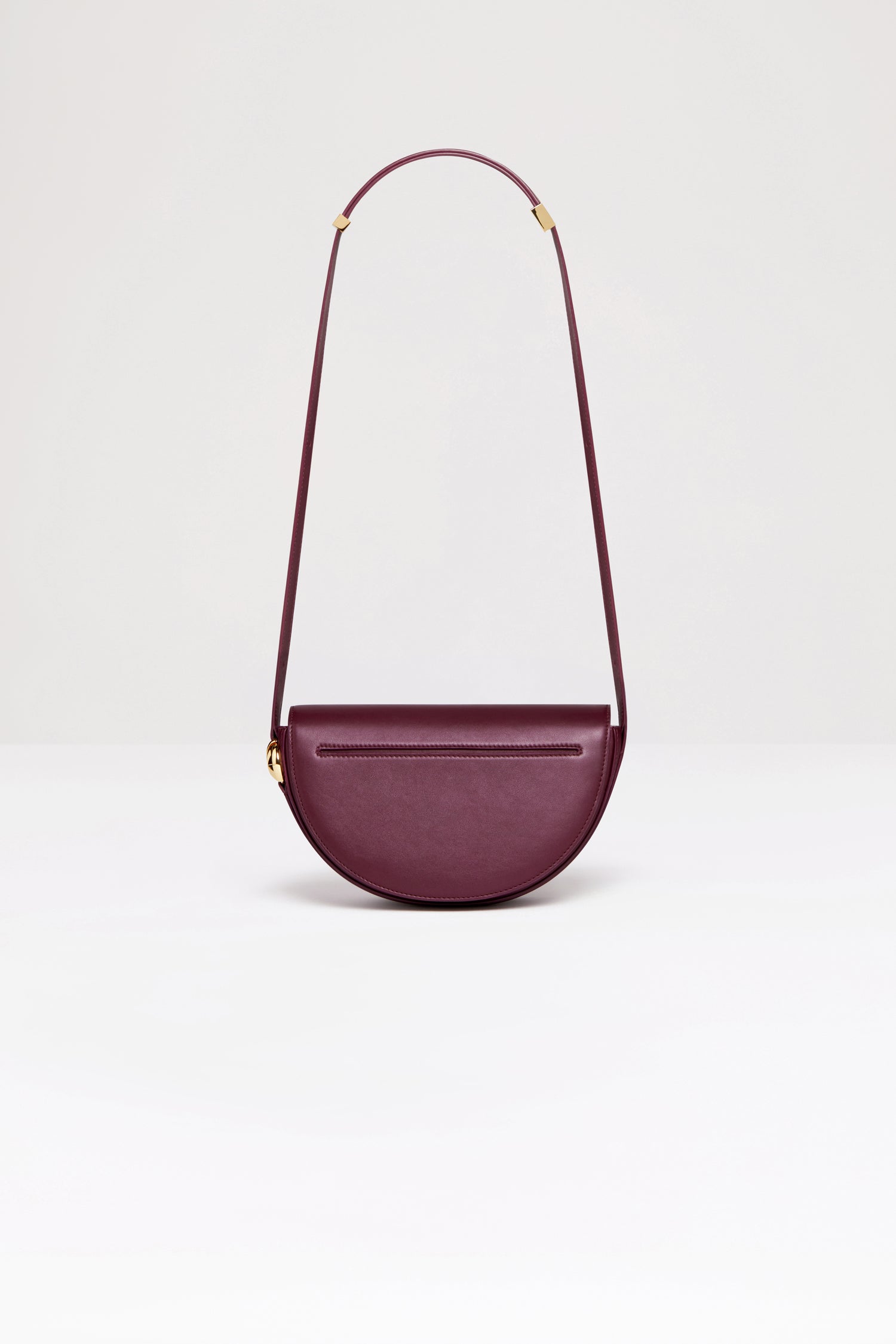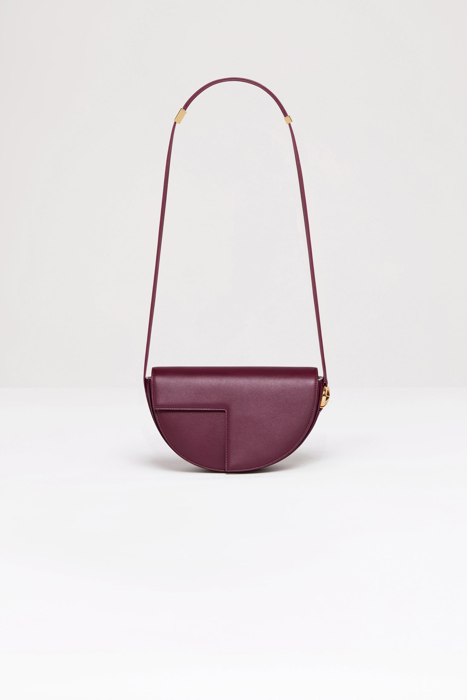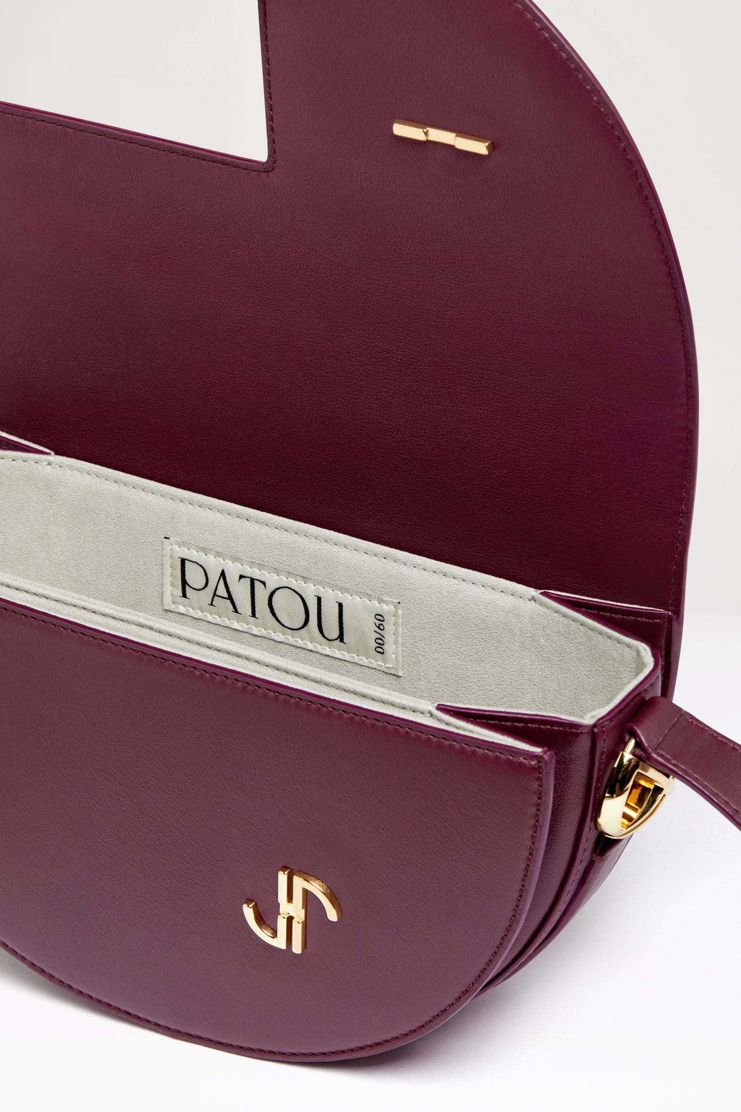 カーマイン のレザーハンドバッグ。 未使用レザーから持続可能な方法により調達した独自の素材で作られた限定エディション。番号入り60点限定エディション。JPモノグラムにインスピレーションを得た幾何学的なカットアウトをあしらった半円形のフォルム。サイドにゴールドトーンのメタルパーツとJPモノグラム ディテール。調整可能なストラップで、ショルダーバッグ、クロスボディバッグ、ハンドバッグとしてお使いいただけます。ゴールドトーンのJPディテールをあしらったマグネットクロージャー。内部に複数のコンパートメント。エコライニング。