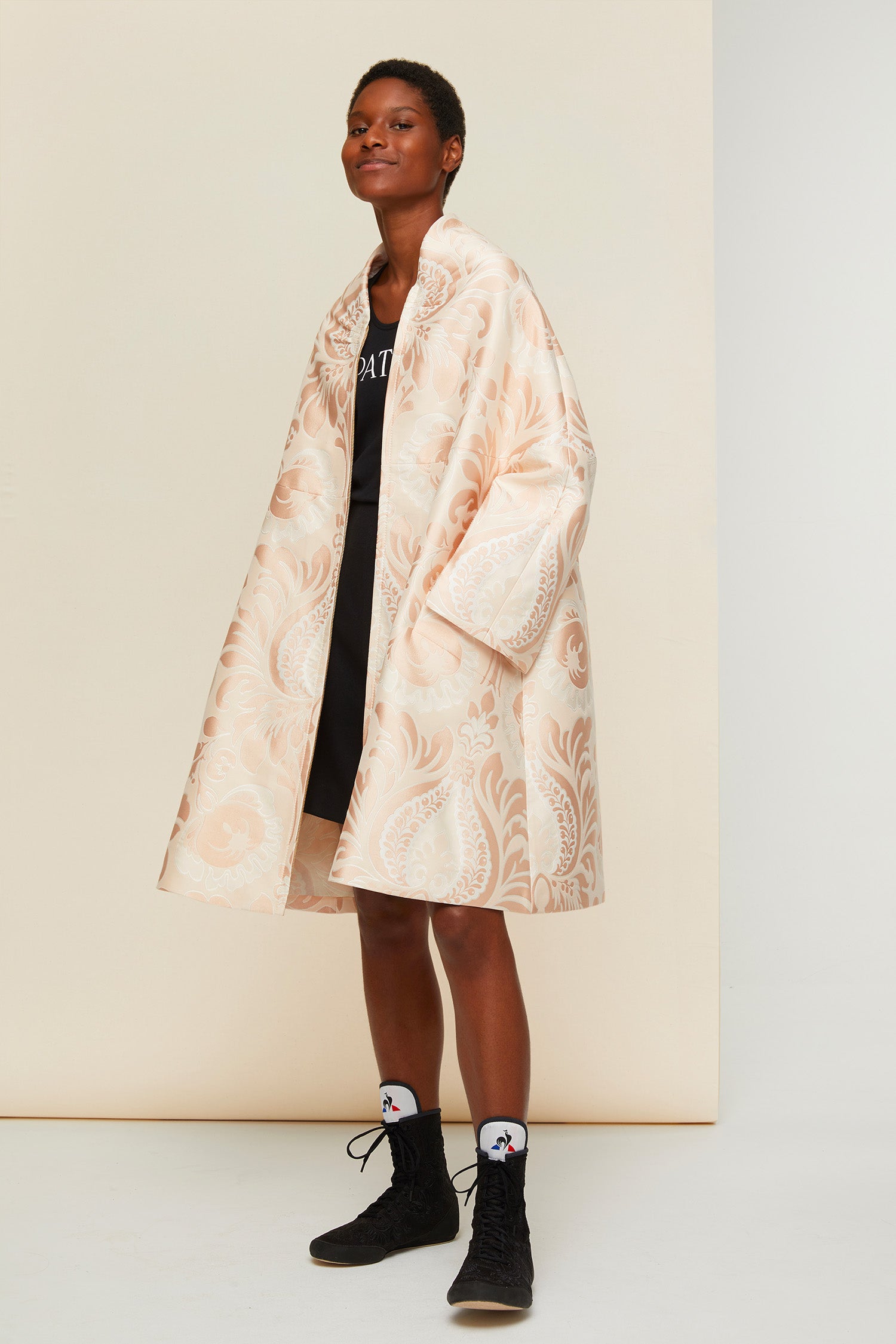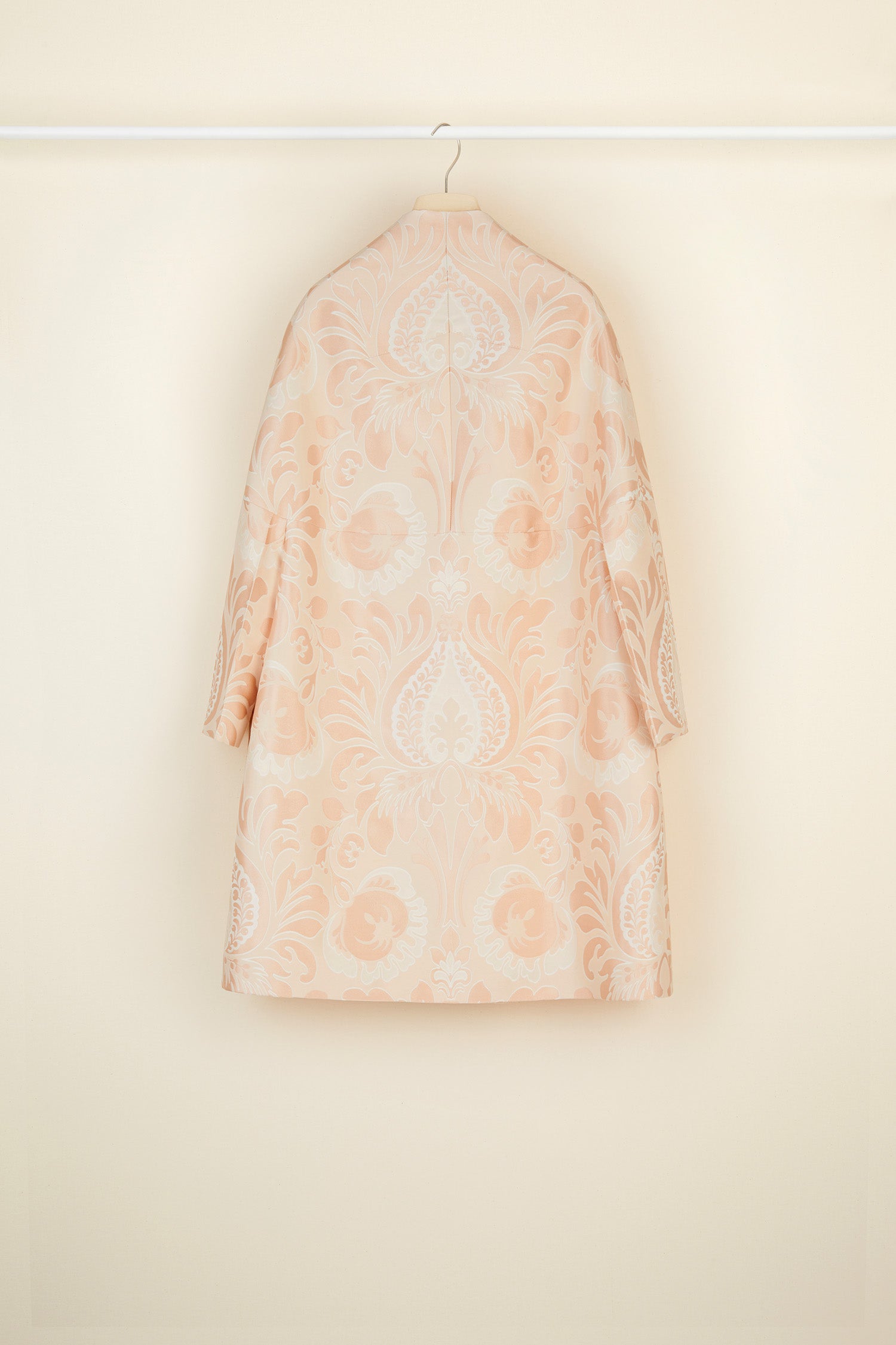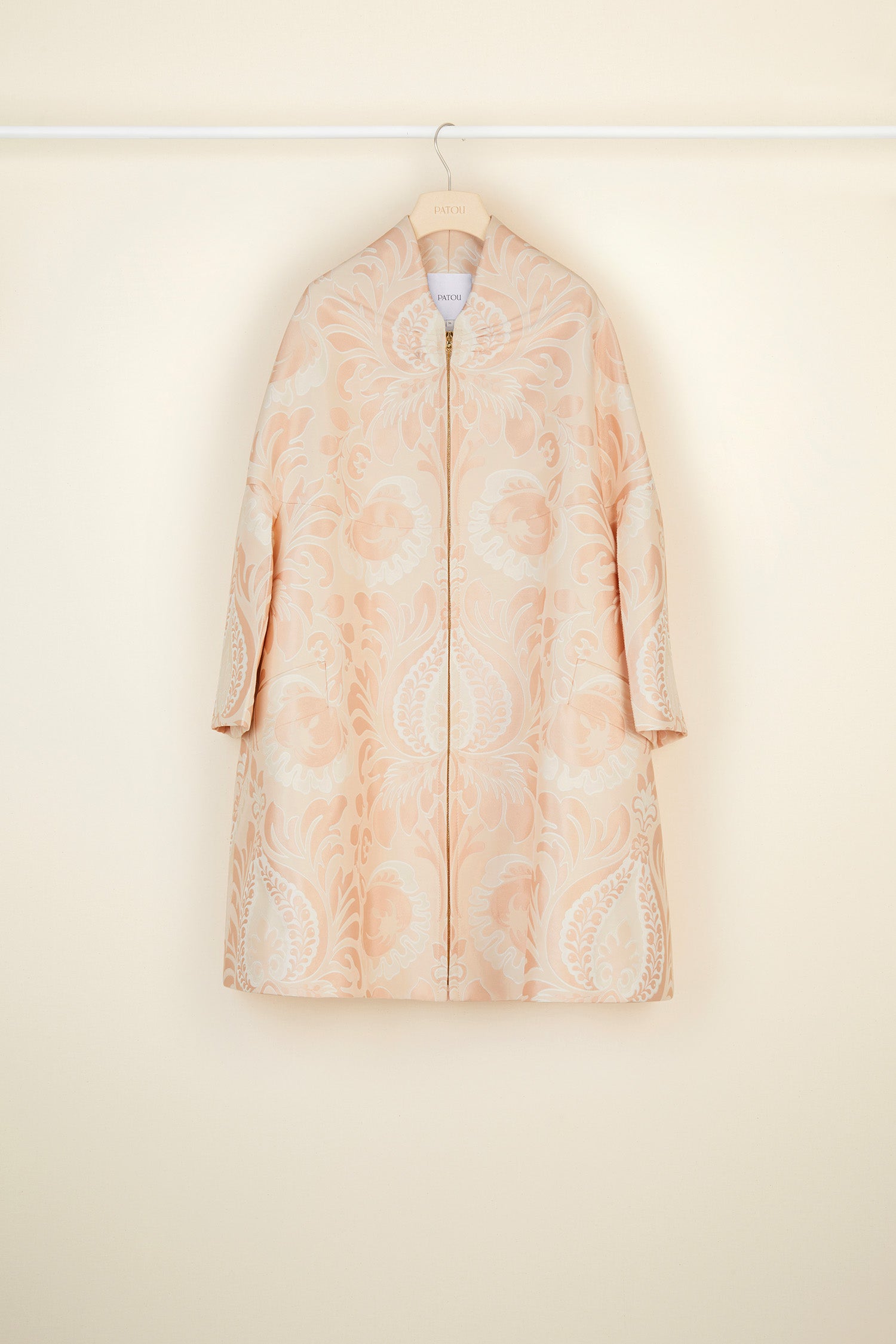 オーバーサイズのピーチブロッサム シルク ブロケードコート。フレアーシルエットのソフトな構造。スワンカラーにシャーリングのディテール。フロントにエングレーヴィング入りのゴールドカラーのファスナー、大きなサイドポケット2個。後ろに幾何学的なダーツ。全体に裏地付き。