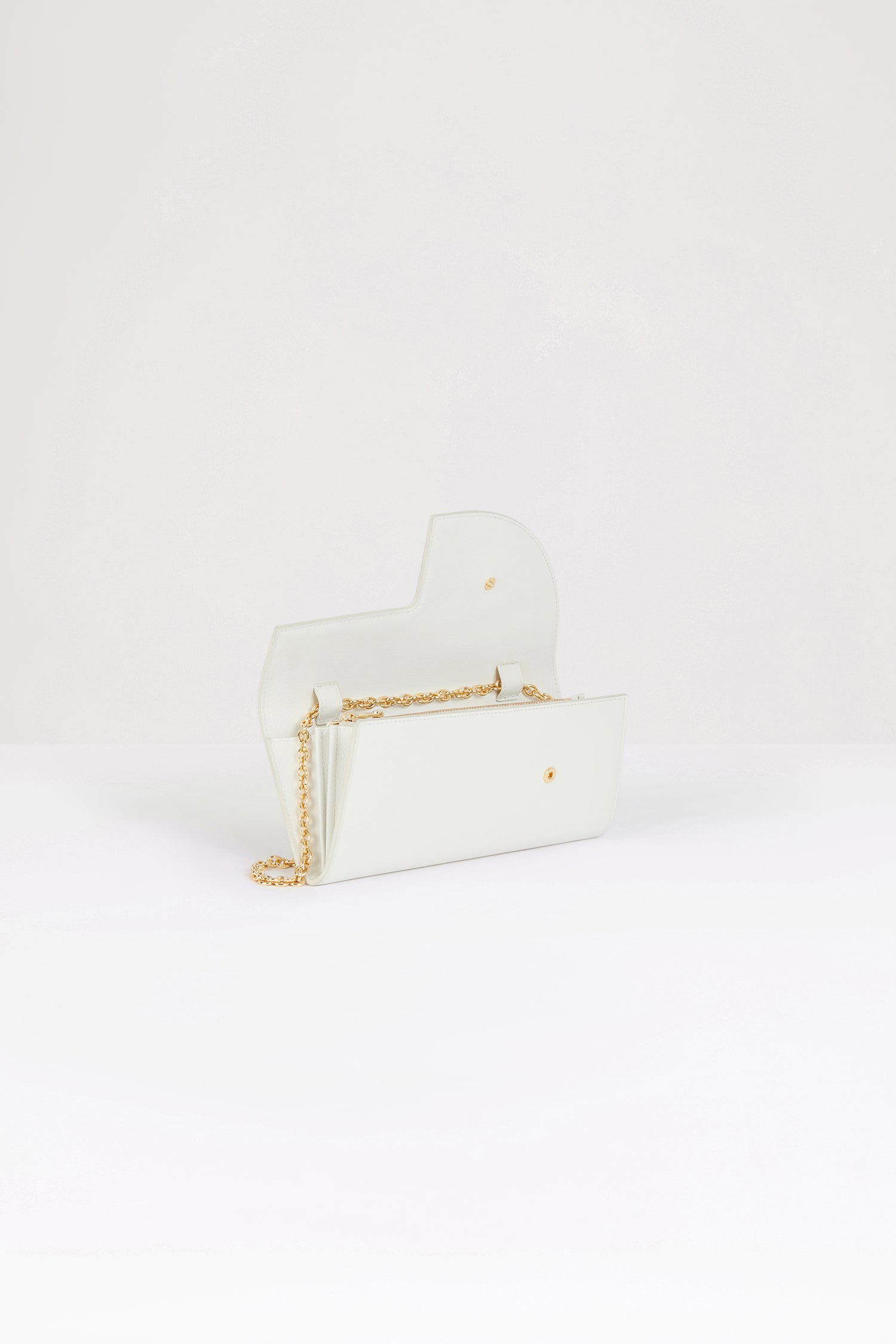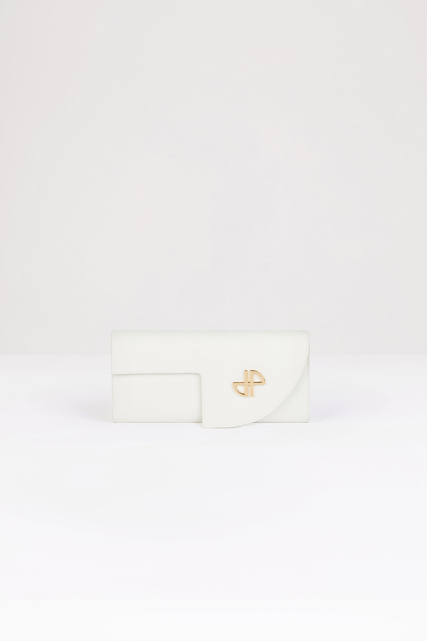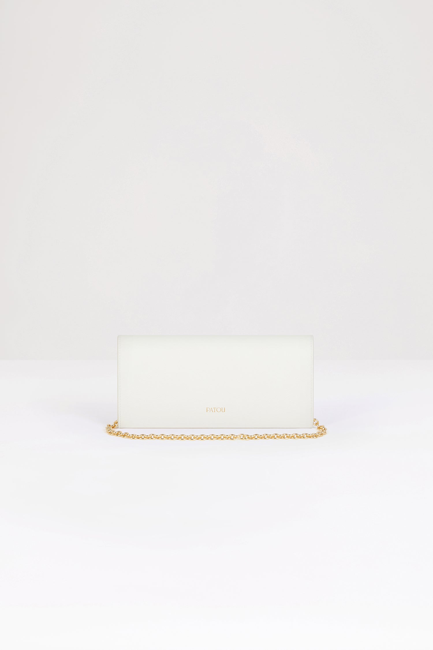 ホワイトのレザー製クラッチ。コンパクトなデザイン。ゴールドトーンのチェーンストラップ。カットアウト入りのフラップ、ゴールドトーンのJPディテール。スナップ開閉。ファスナー付きコンパートメント。バックにゴールドのエンボス加工Patou。