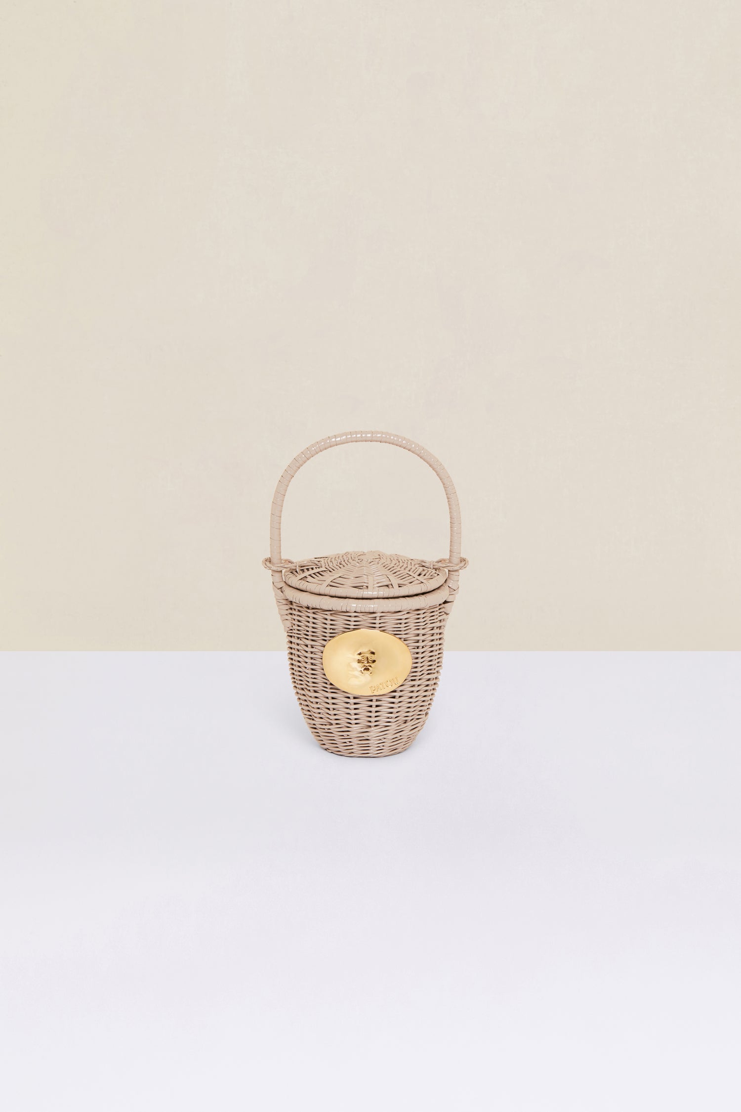パーチメントベージュのウィッカー バケツバッグ。スライドリッド付きのトップハンドル。「真実の口」から着想を得たゴールドトーンの装飾。