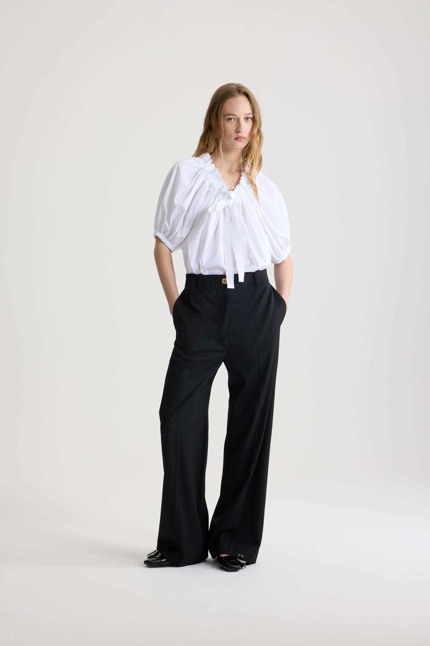 ホワイトのオーガニックコットン製Tシャツ。前面にフラウンス、グログランタイをあしらった、ドローストリング付きの襟。首元で結ぶかオフショルダースタイルで着用可能。袖口に伸縮性があるバルーンスリーブ。