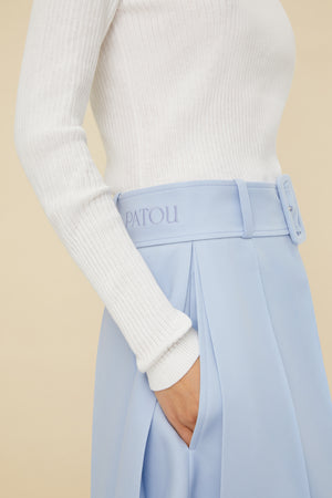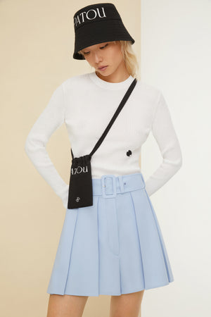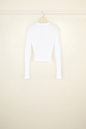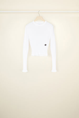 ホワイトのオーガニックコットン製ジャンパー。ぴったりフィットしたシルエット。リブニット スタイル。クルーネック。ロングスリーブ、ややフレアの袖口。フロントにブラックのJPロゴ刺繍。