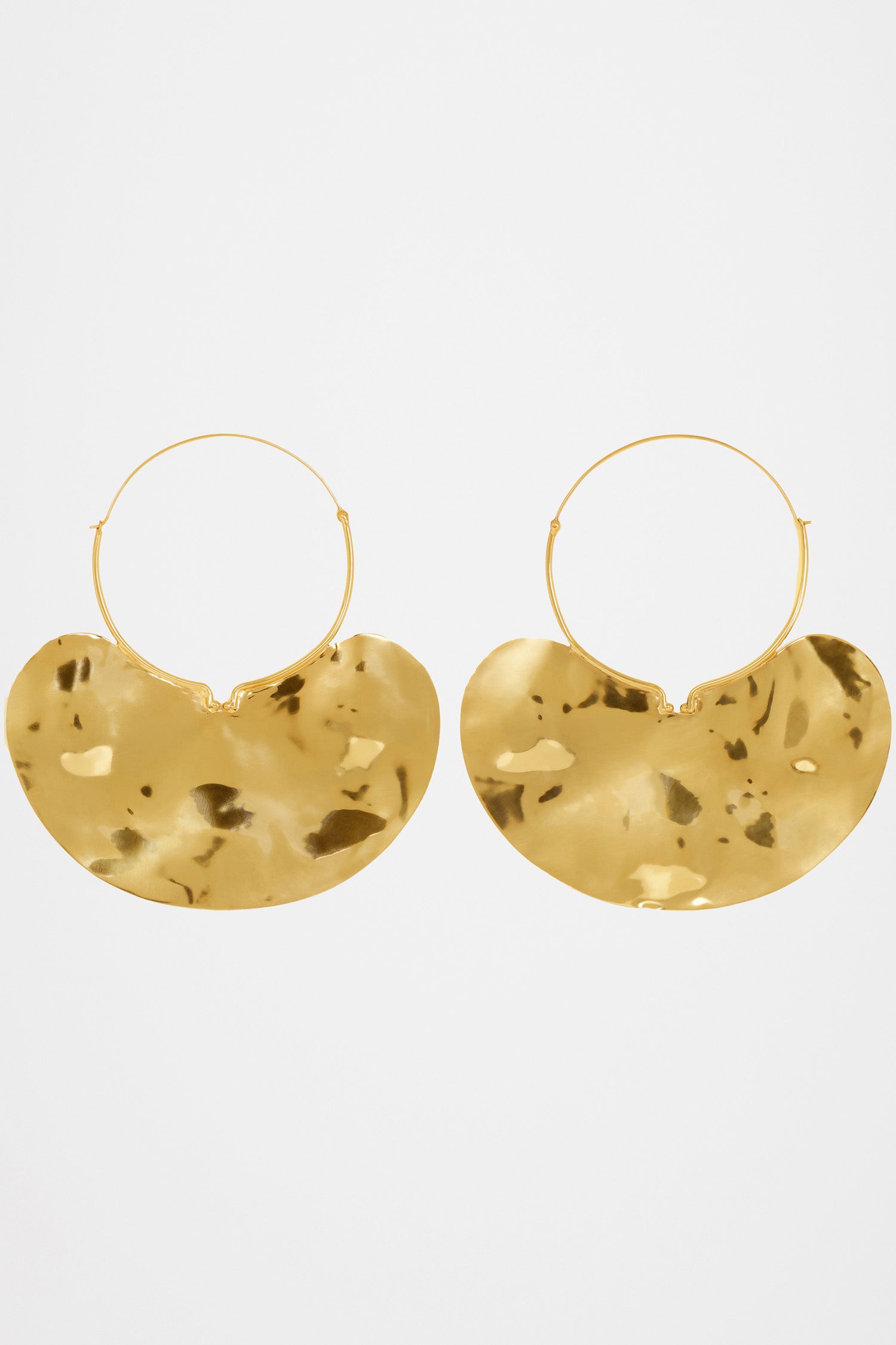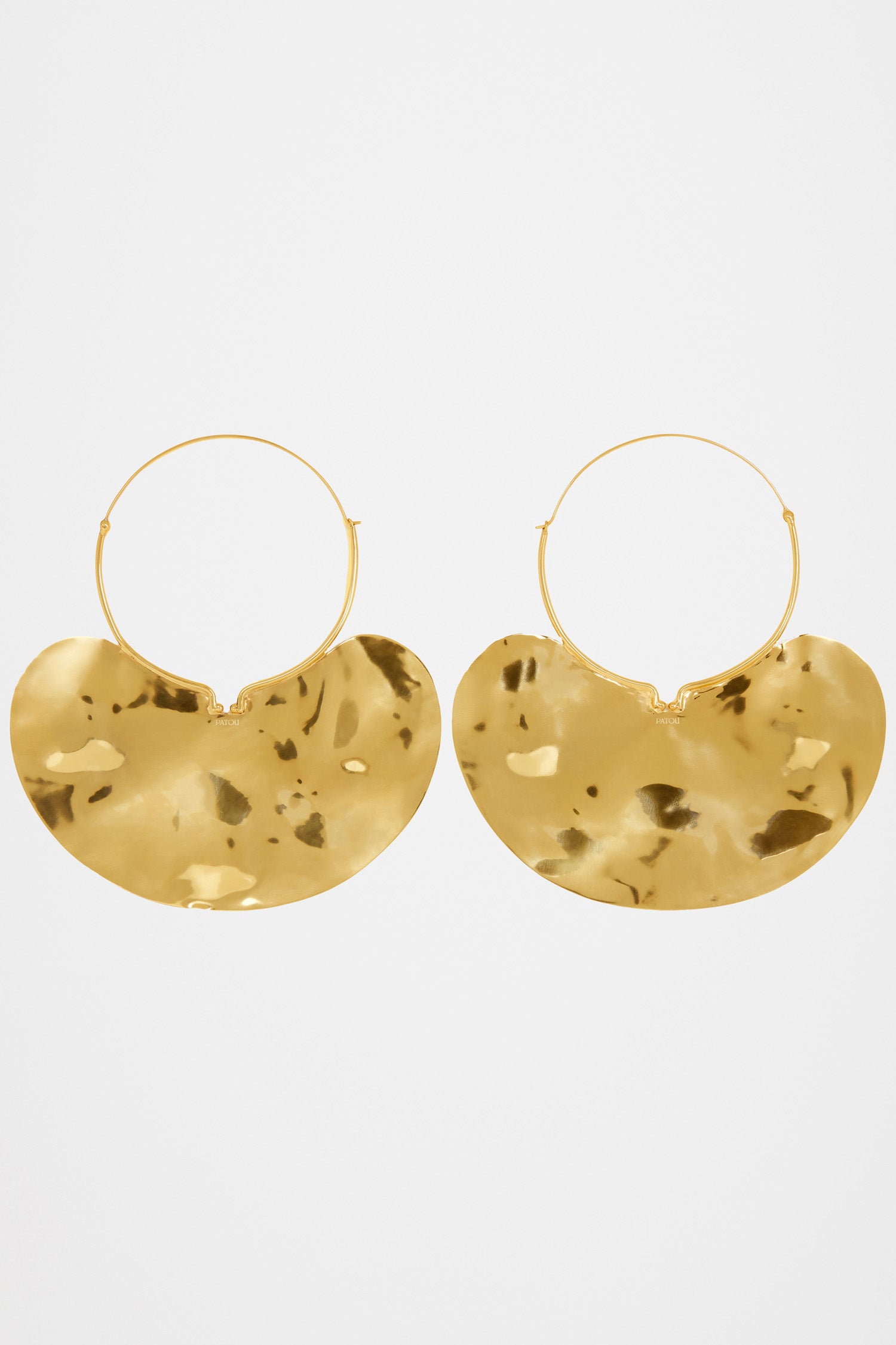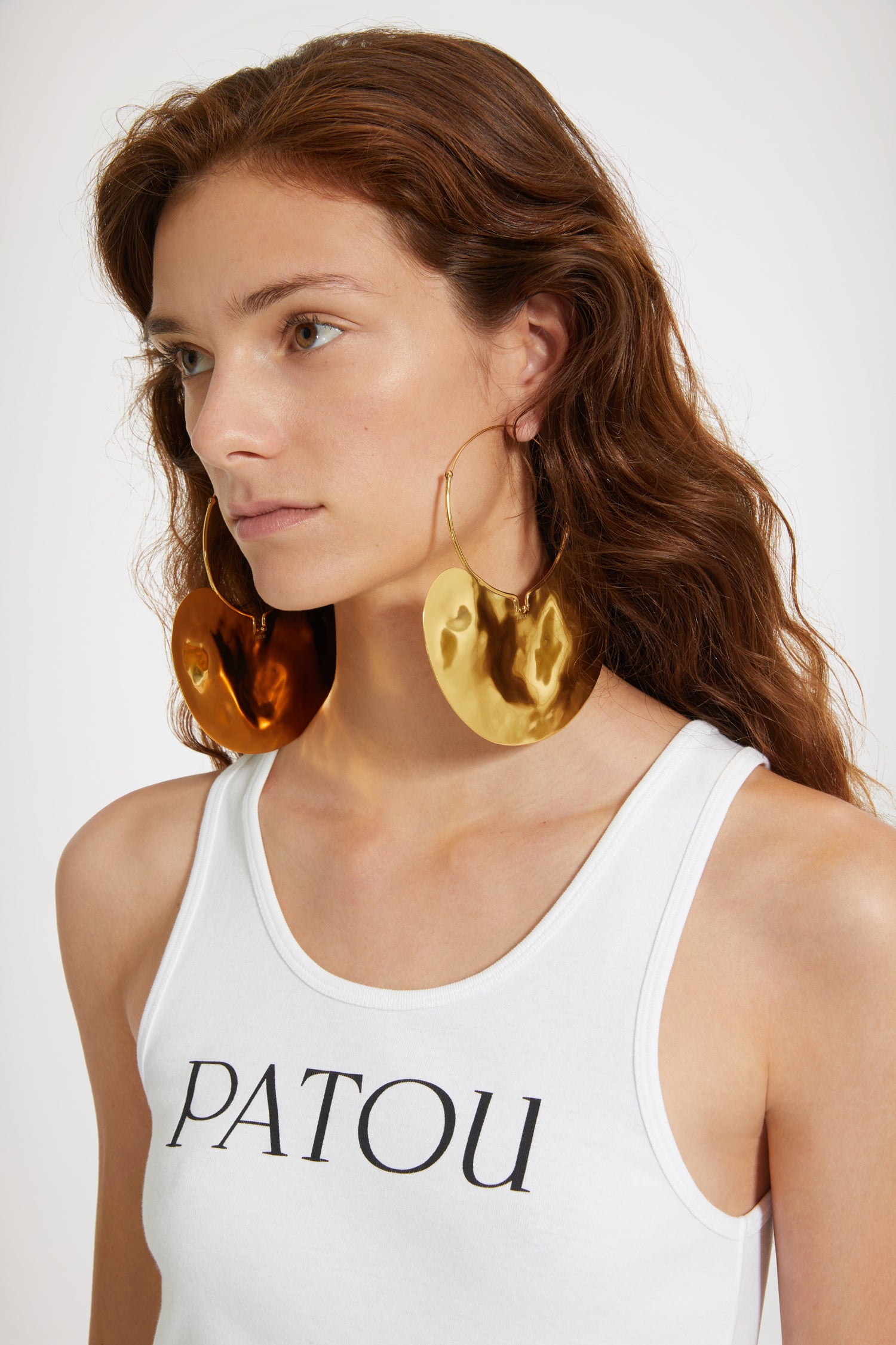 ゴールドプレート加工の真鍮製ラージフープイヤリング、パトゥのロゴを刻印したハンマー加工のプレート。