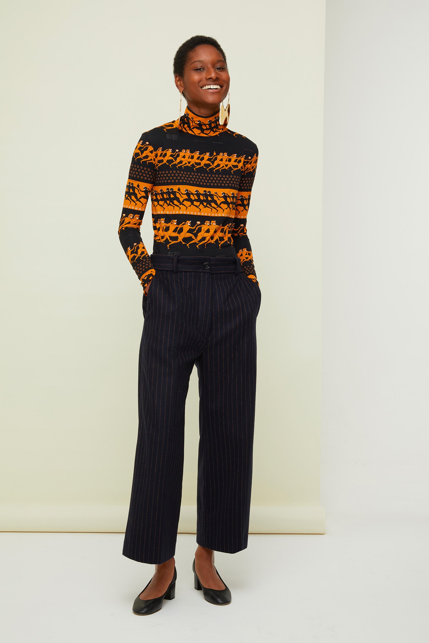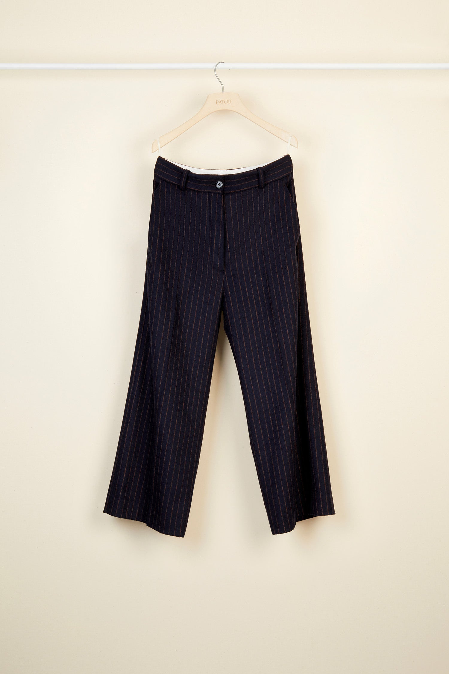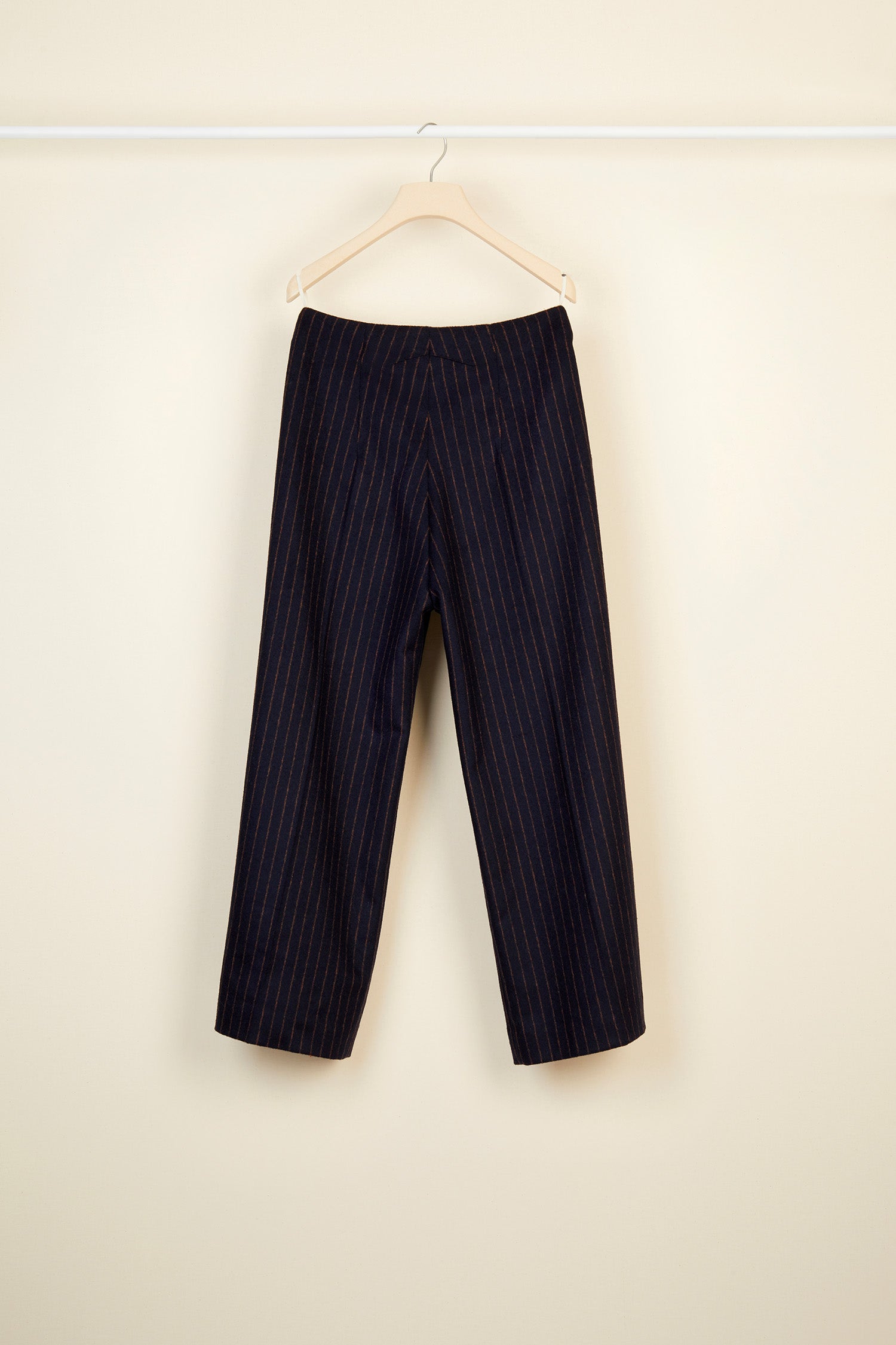 ネイビーブルー&バーントシエナのチョークストライプ パンツ。ストレートレッグのテーラードスタイル。エングレーヴィング入りのゴールドカラーボタン、フロントにファスナー。ベルトループ、サイドポケット2個。後ろにダーツ。裏地付き。