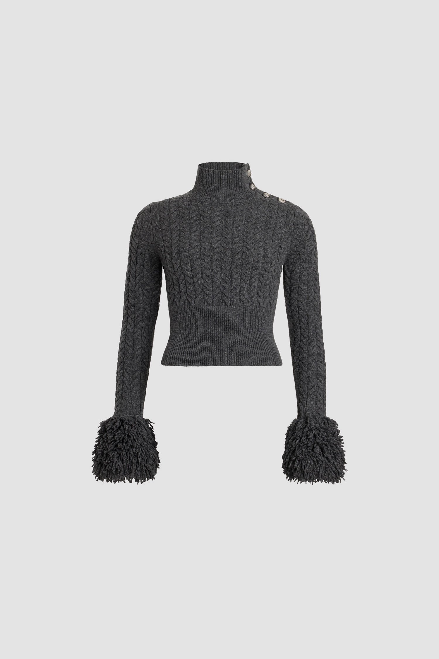 マーキュリーグレーのメリノウール&カシミア製セーター。ケーブルステッチ。肩にシルバートーンの半球状JPボタン付きのモックネック。リブ編みの襟と裾。袖にファー仕立てのフリンジディテール。