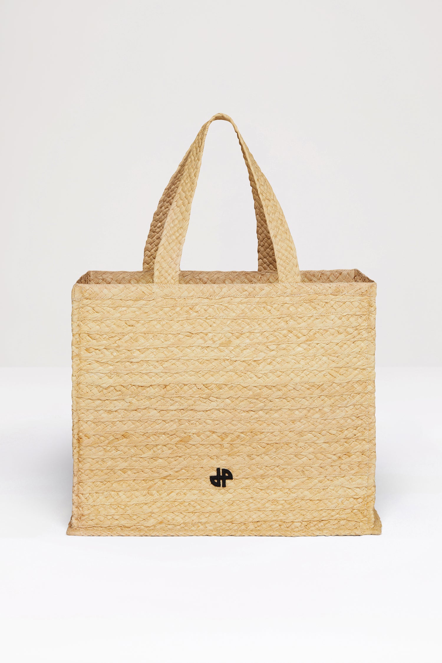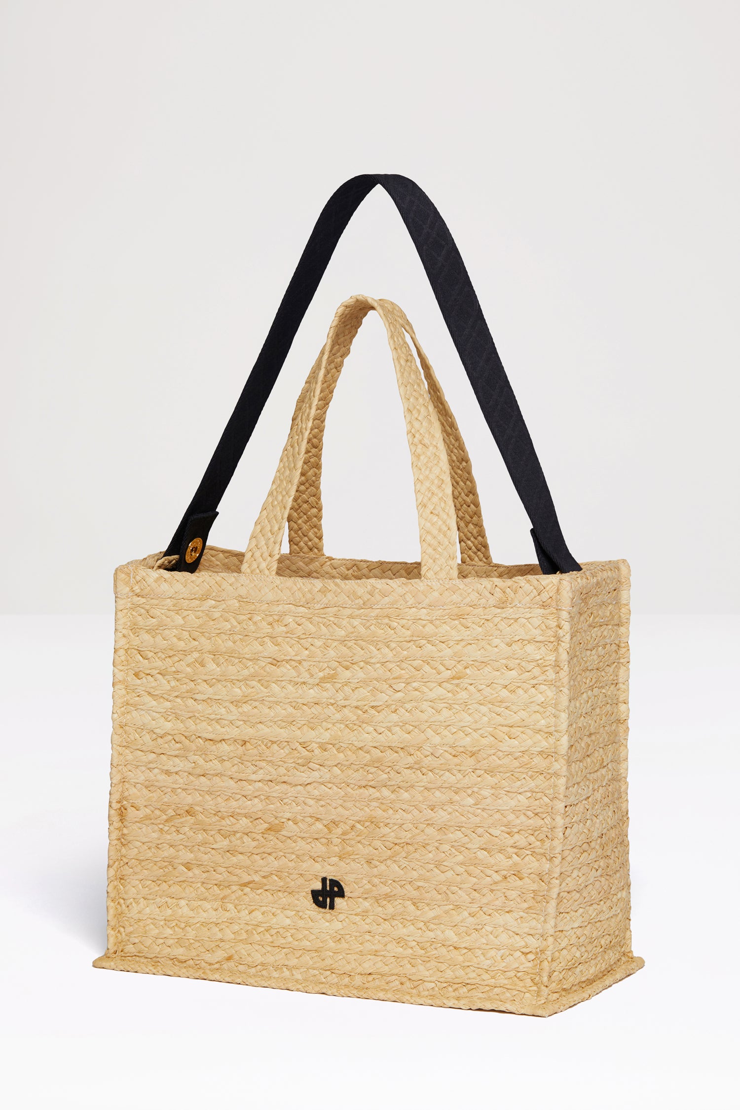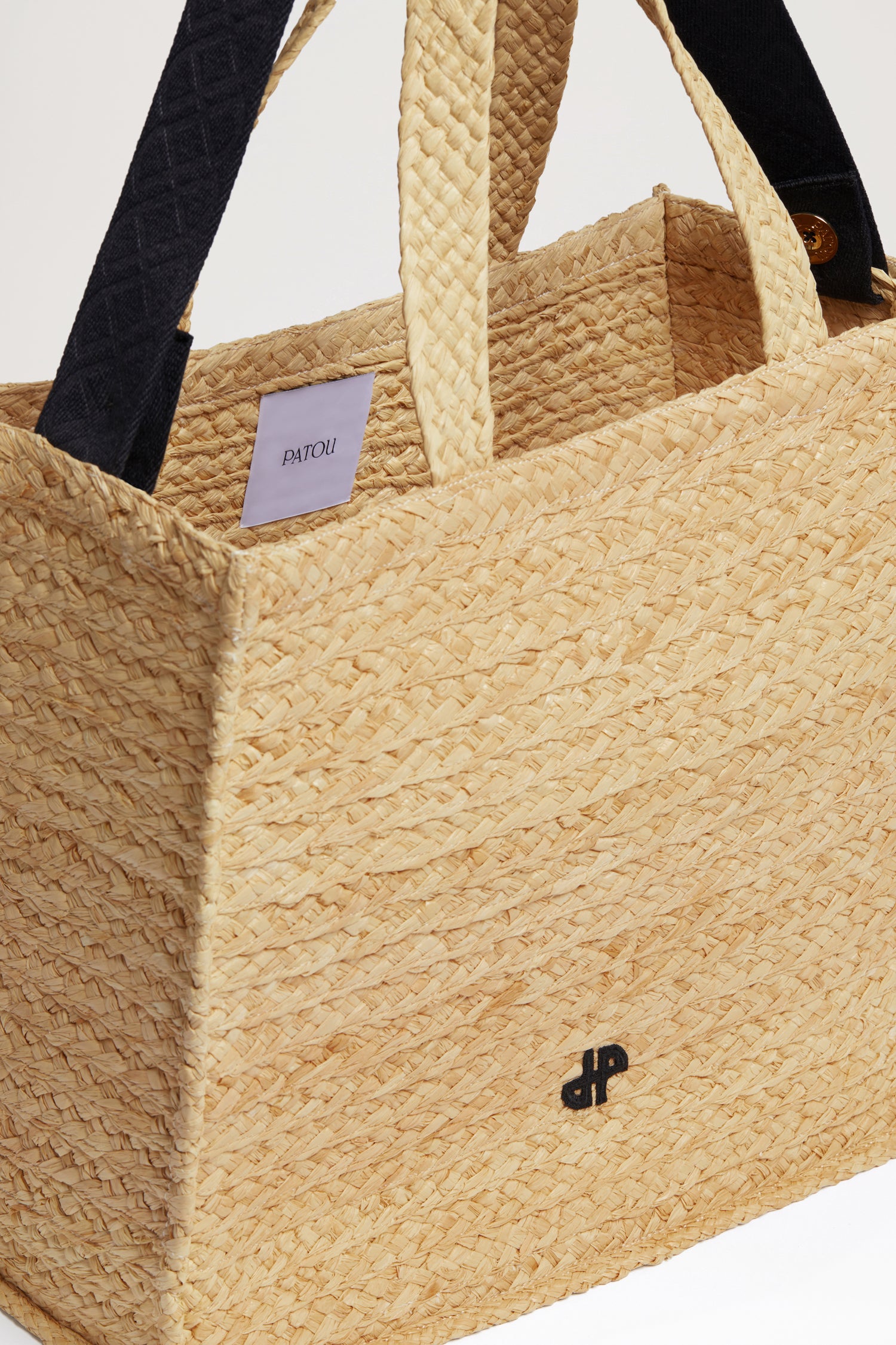 バニラカラーのラフィア製トート。フロントにJPモチーフ。ゴールドボタンをあしらった、ブラックカラーのエンボス加工キャンバス製ショルダーストラップ。2つのトップハンドル。ハンドバックあるいはショルダーバックとしてご使用いただけます。