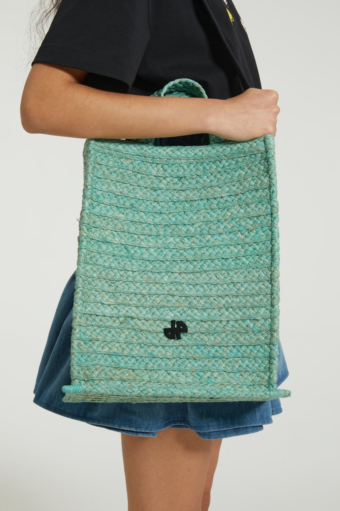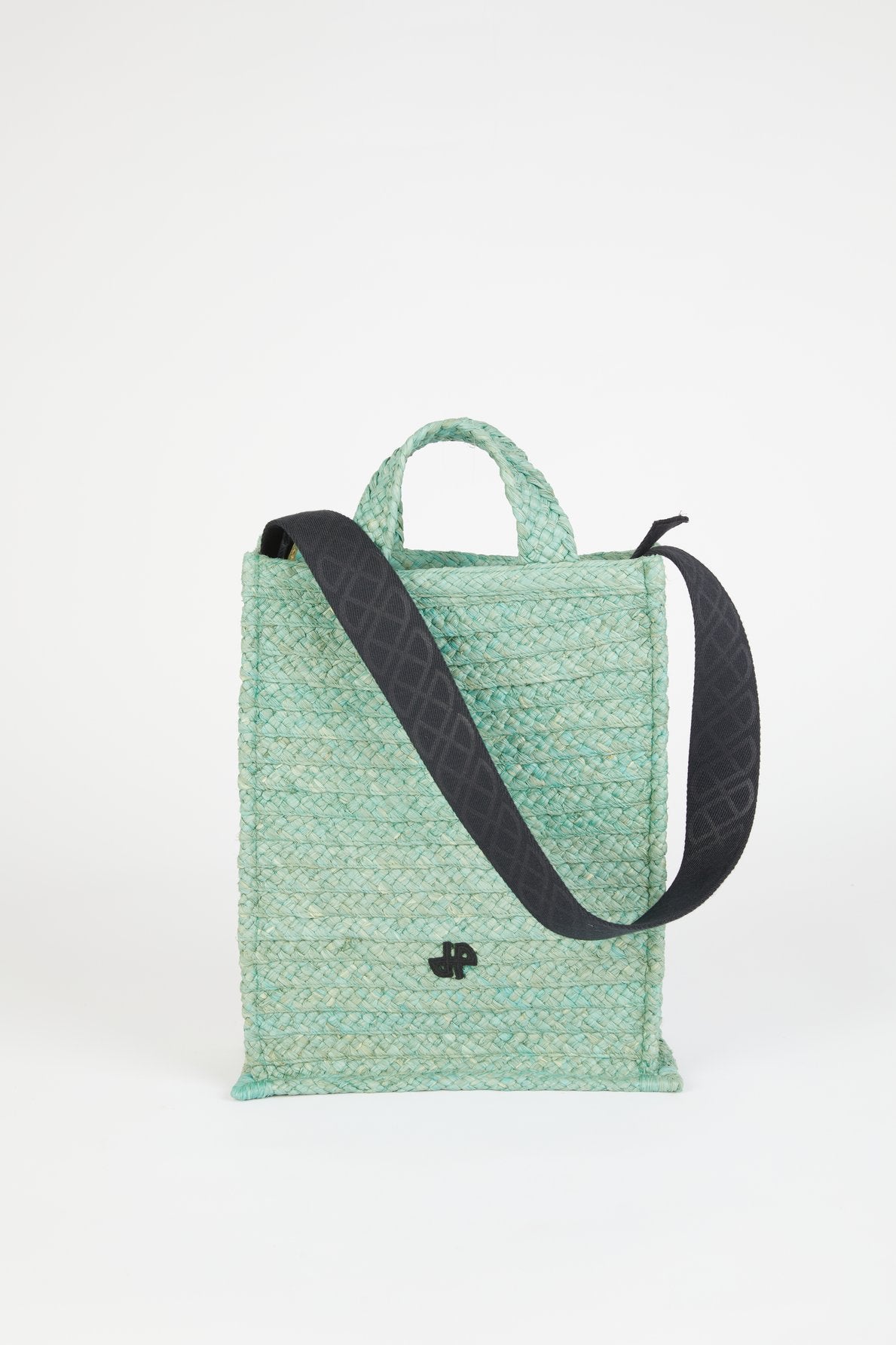ミントグリーンのラフィア製トート。フロントにJPモチーフ。ゴールドボタンをあしらった、ブラックカラーのエンボス加工キャンバス製ショルダーストラップ。2つのトップハンドル。ハンドバックあるいはショルダーバックとしてご使用いただけます。