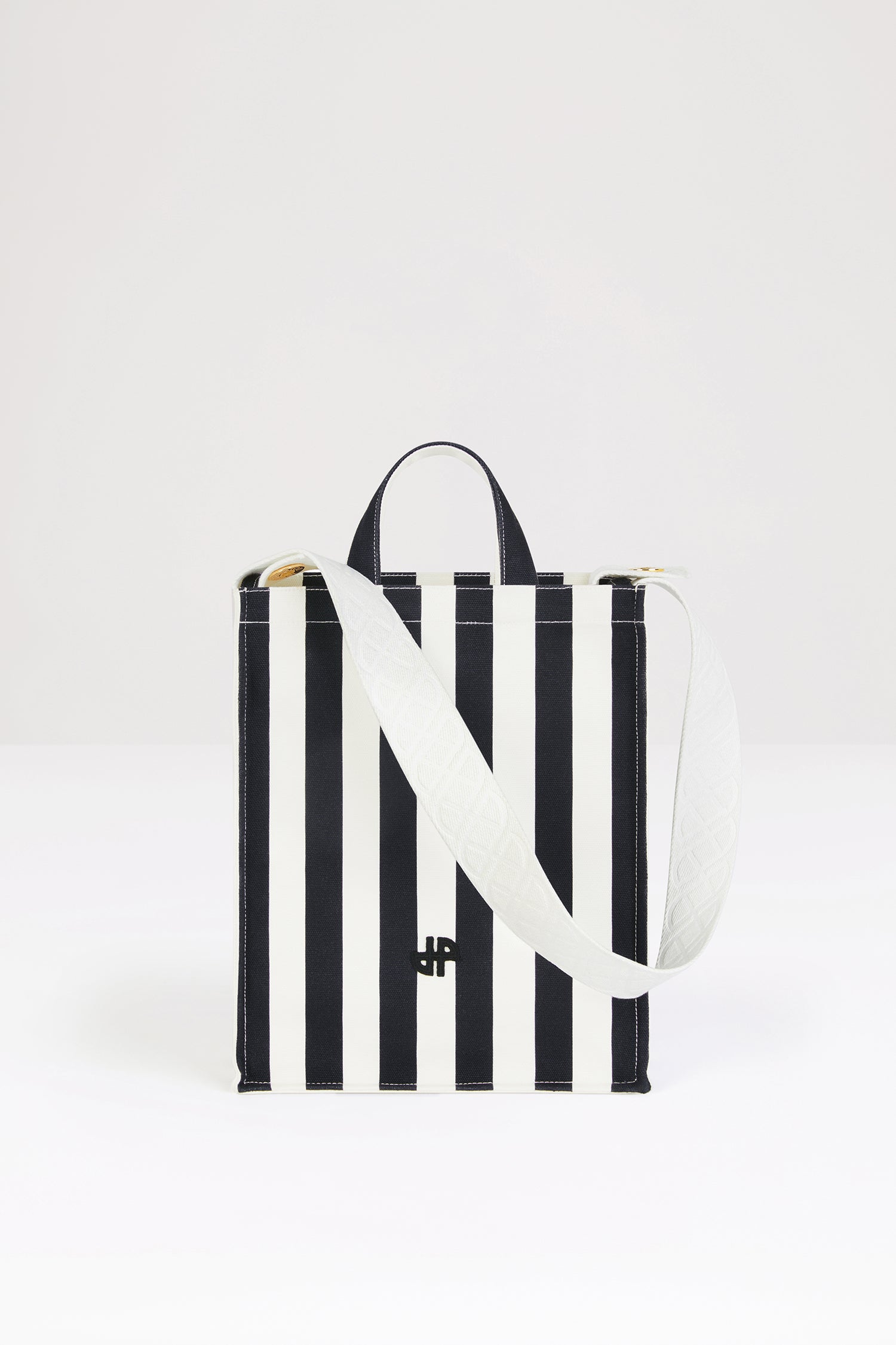 ブラック&ホワイトのコットンキャンバス製トート。ストライプパターン。JP刺繍入り。ゴールドボタンをあしらったエンボス加工ショルダーストラップ。2つのトップハンドル。ハンドバックあるいはショルダーバックとしてご使用いただけます。