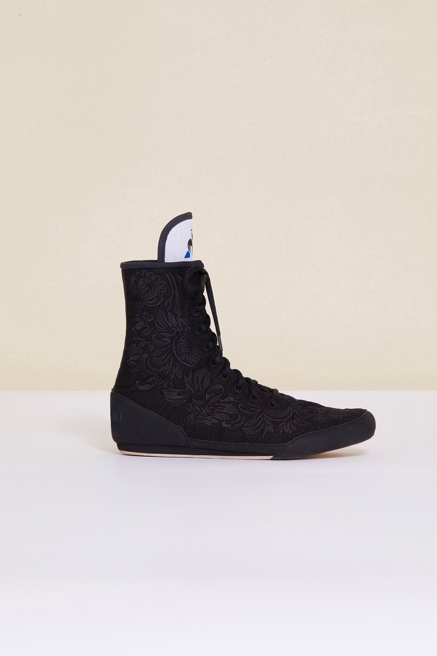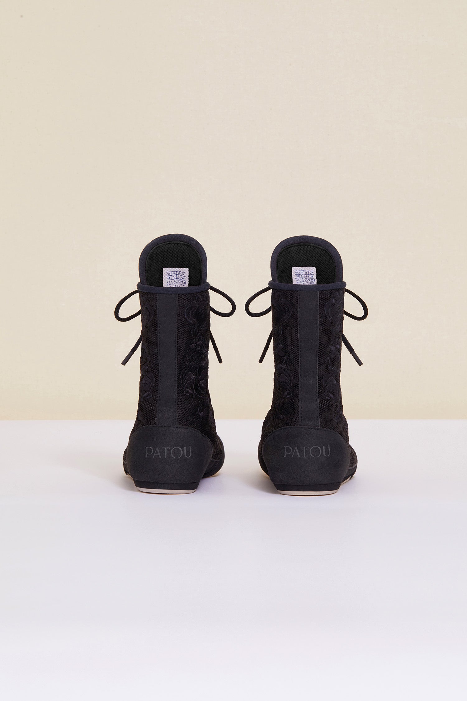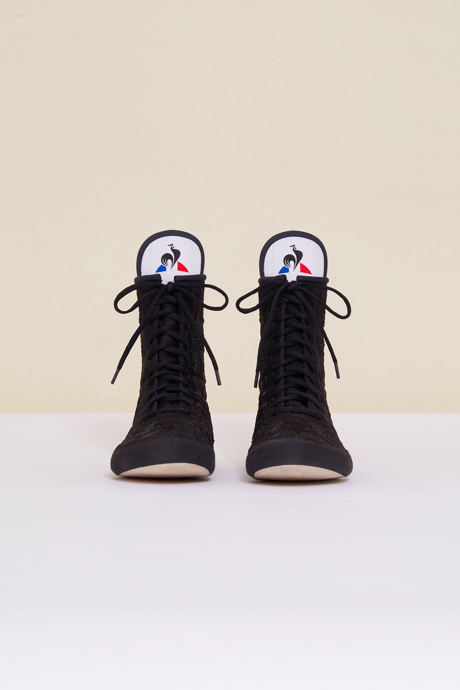 파투와 르 꼬끄 스포르티브와의 첫 콜라보레이션을 통해 제작된 스니커즈. 클래식 복싱 슈즈에서 영감을 얻은 블랙 컬럴의 하이탑 스니커즈. 모노크롬 플로럴 자수, 파투 로고 인그레이빙 장식의 힐. 오리지널 르 꼬끄 스포르티브 로고가 장식된 텅. 파투 로고가 양각으로 새겨진 유연한 고무 소재의 밑창.