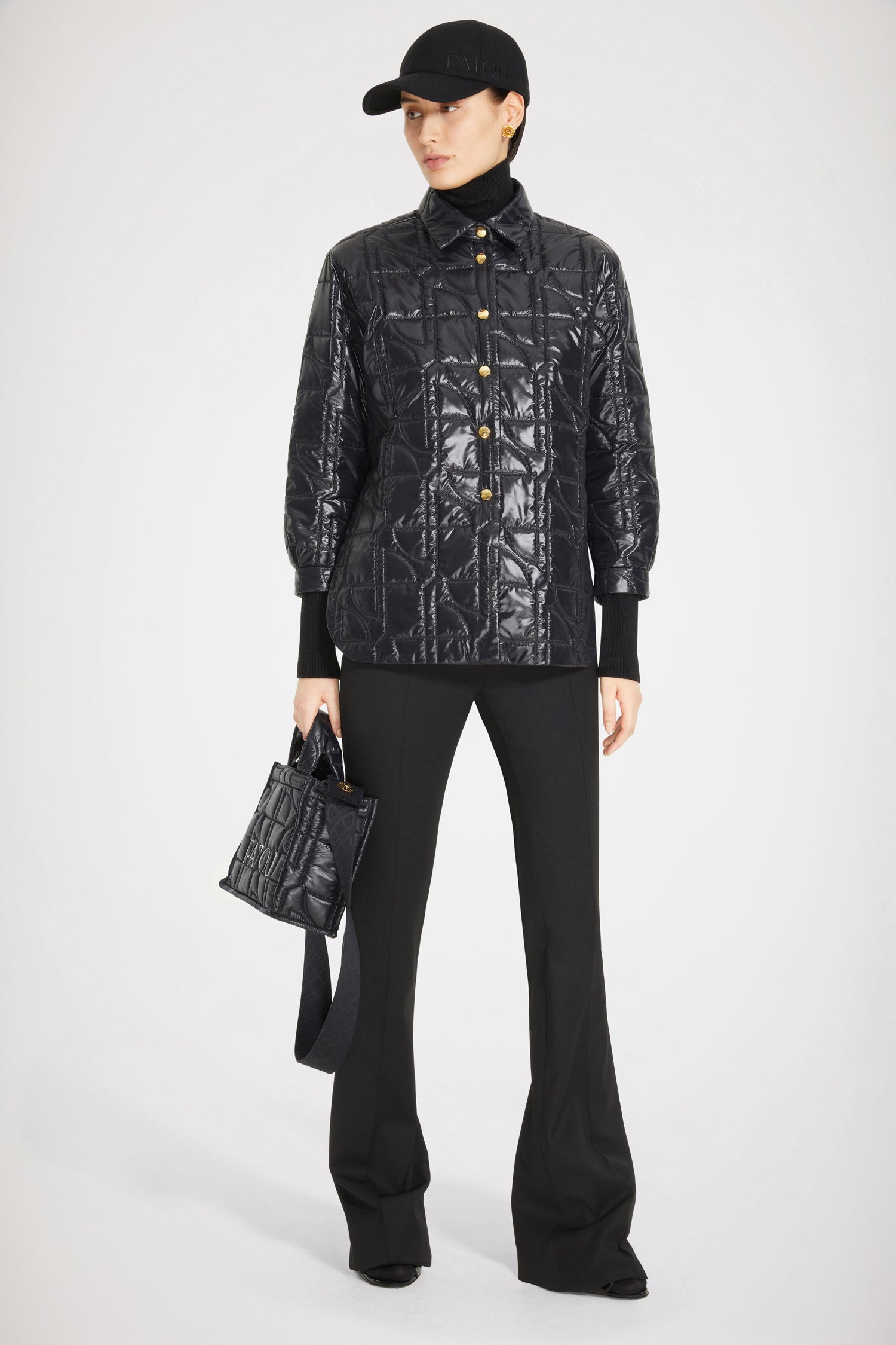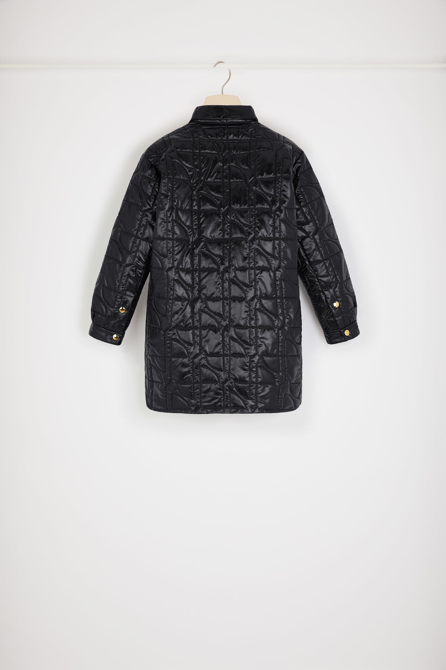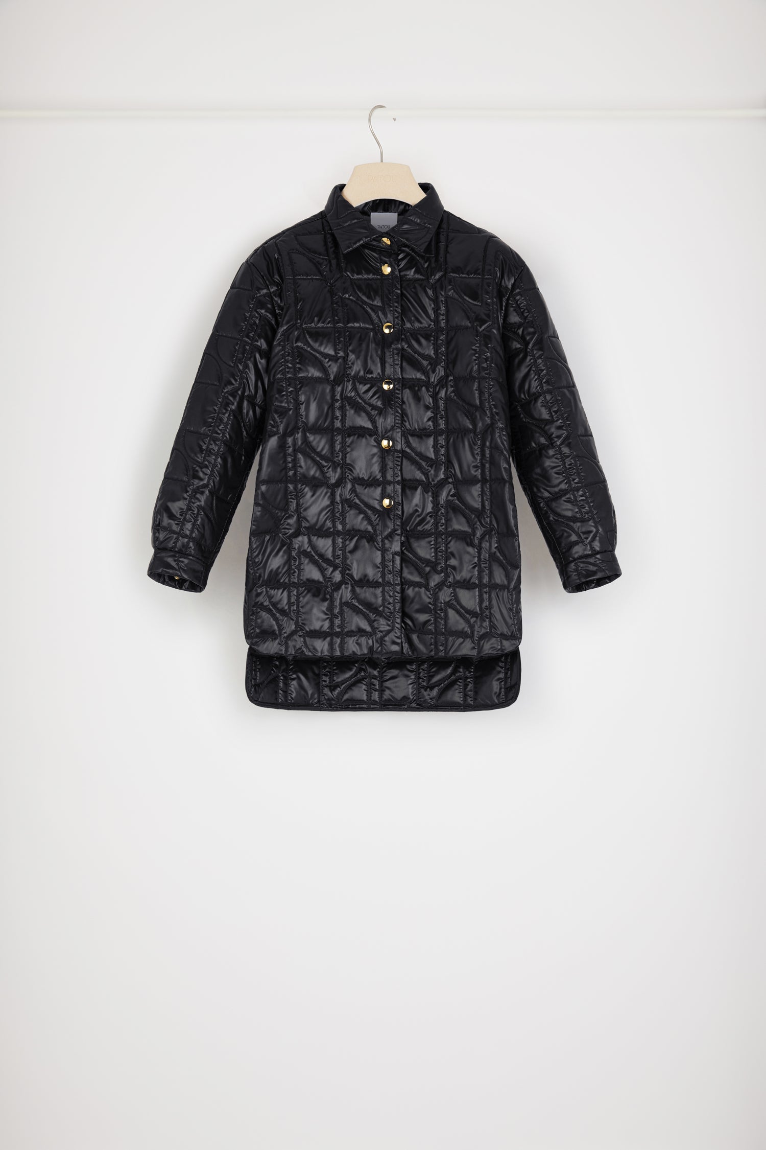 블랙 컬러의 재생 폴리아미드 소재. JP 올오버 퀼팅. 뒷면이 더 긴 비대칭 실루엣. 앞면와 커프스의 골드 톤 스터드 버튼. 크롭 슬리브.