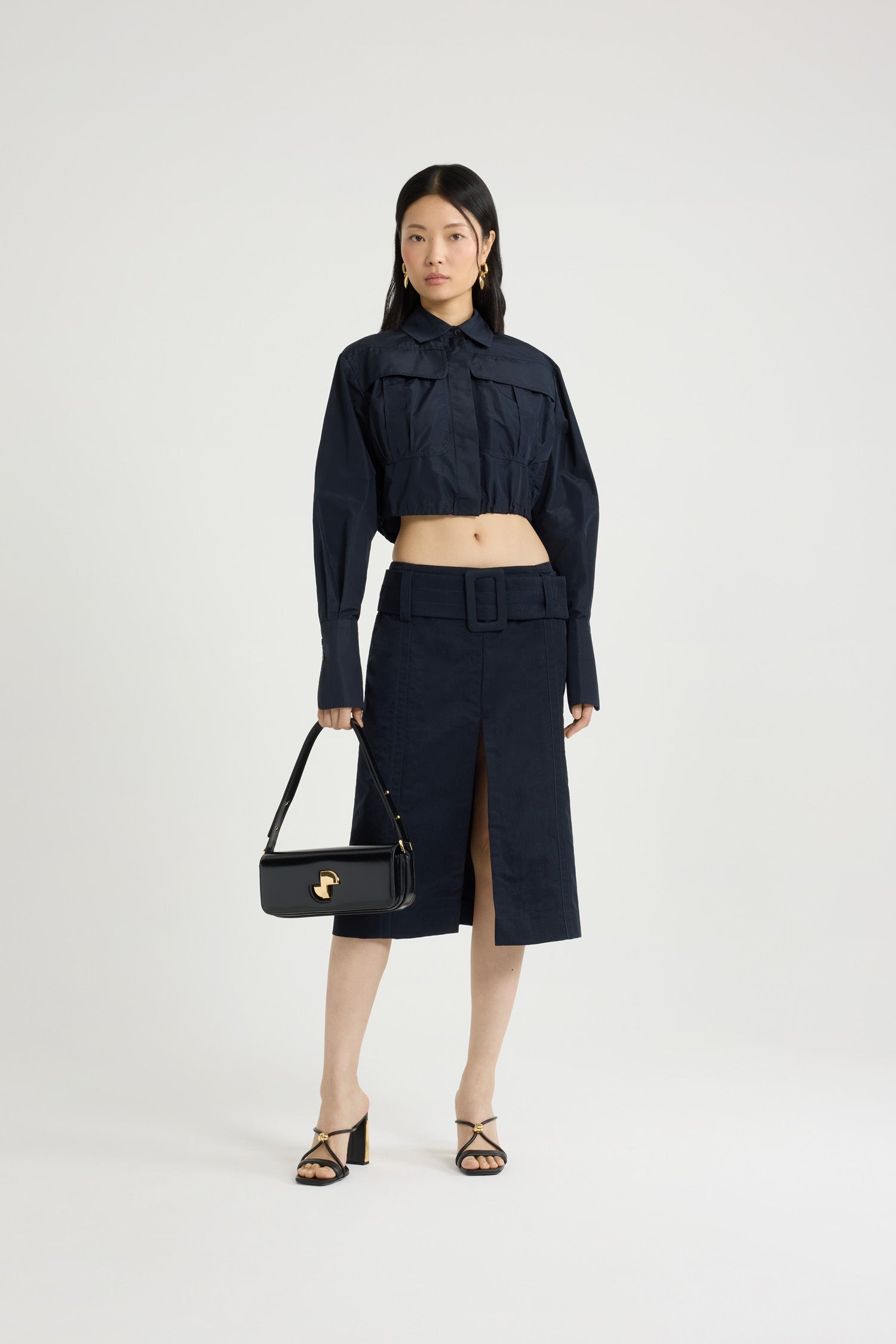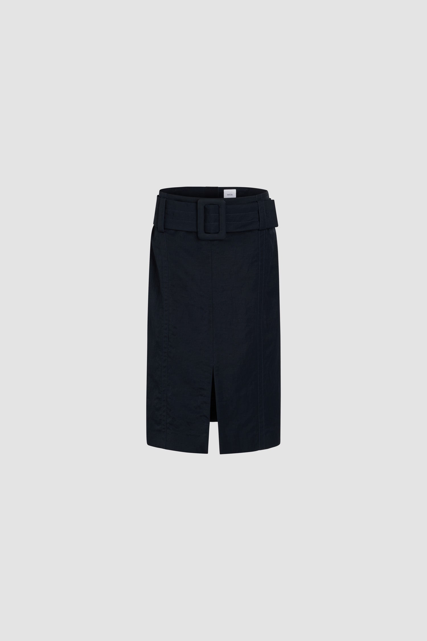 경량 재생 나일론 소재 벨트 미디 스커트.