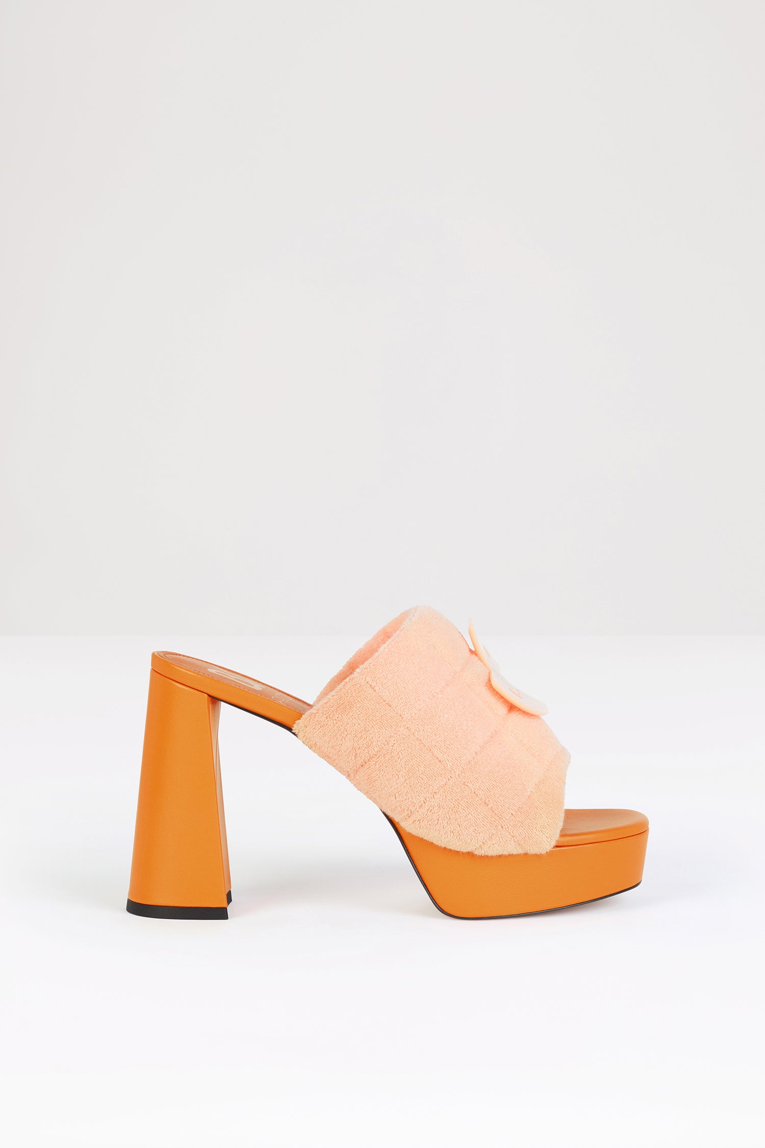 아브리콧 오렌지 컬러의 코튼 테리 소재. 파리의 슈즈 브랜드 베티나 버밀론(Bettina Vermillon)과의 특별한 콜라보레이션. JPBV 아플리케 장식 웨이브 퀼팅 어퍼. 11cm 블록 힐.