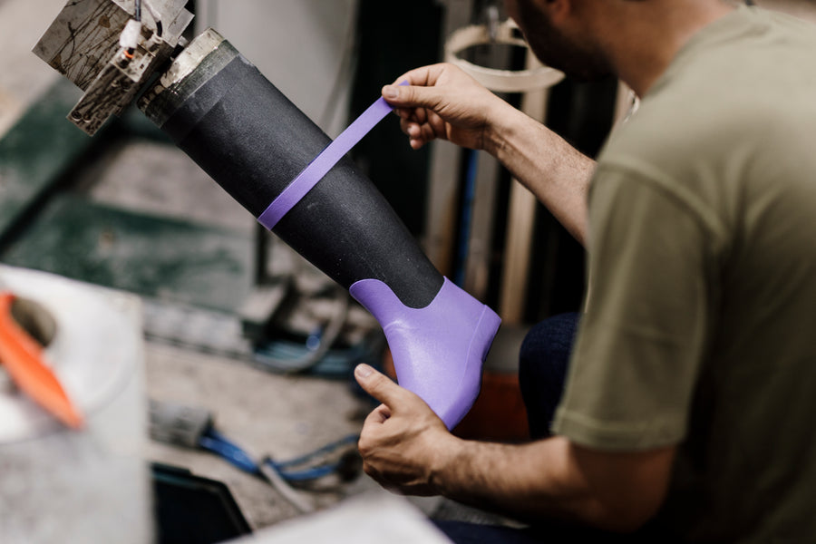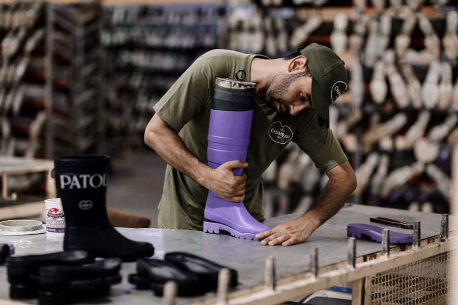 Made from high grade natural rubber, Patou and the French bootmaker Le Chameau collaborated to create two unique styles in two colors. Since 2005, Le Chameau works only with the highest-grade A rubber from a plantation in Vietnam. The rubber quality is light in color, with low ash and dirt content. Each element is carefully studied and crafted to perfection to keep the boots malleable, strong and waterproof.  A single Master Bootmaker carries out all the steps in the assembly of each boot. They transform the rubber from a raw to finished material, cutting, assembling, and curing the boot by vulcanising it into a finished product. Two legendary names create a new icon.