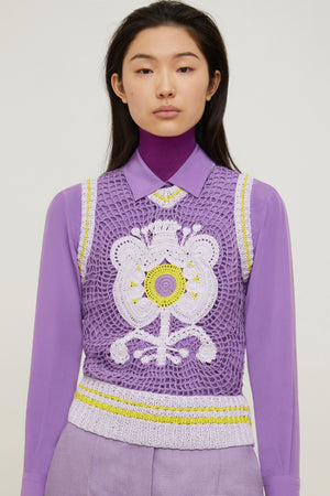 라일락 플라워 크로셰 소재의 베스트. 판타지아 보타니카의 시그니처 프린트에서 영감을 받은 앞면의 플로럴 디자인이 돋보이는 핸드메이드 베스트. 옐로우 스트라이프가 장식된 라일락 컬러의 웨이스트 밴드와 슬리브, 브이넥 라인의 립 디테일.