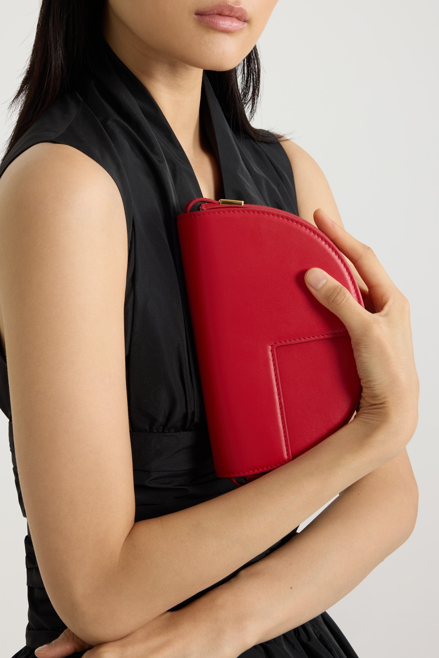 립스틱 레드 스무스 가죽 핸드백. JP 모노그램에서 영감을 받은 기하학적 컷아웃이 돋보이는 반원형 실루엣. 측면에 파투 로고 인그레이빙 디테일의 골드 톤 하드웨어. 길이 조절 가능한 스트랩으로 숄더백, 크로스백, 또는 토트백 스타일로 연출 가능. 골드 톤 JP 디테일의 자석 잠금. 내부 수납공간.