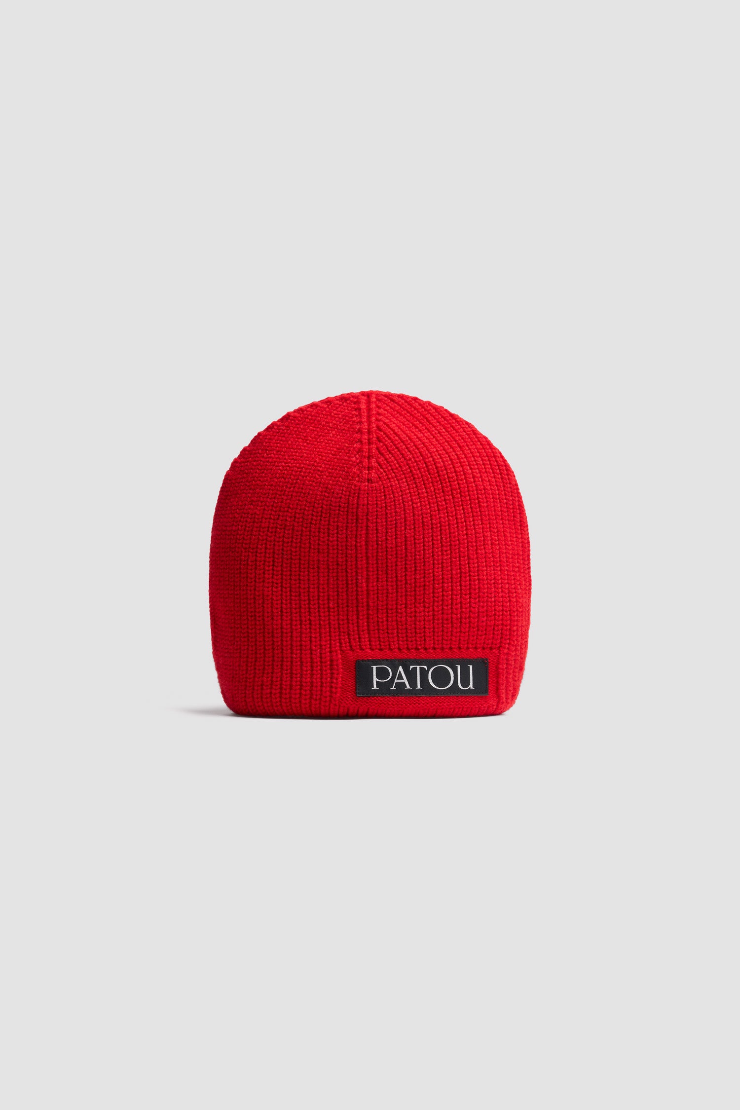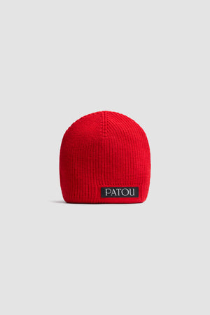 매더 레드 컬러의 울 및 캐시미어 비니. 립 스티치. 앞면의 파투 로고 라벨.