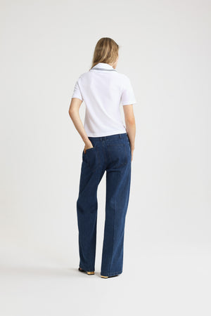 화이트 오가닉 피케 코튼 폴로 셔츠. 스트라이프 자수 장식 칼라. 가슴에 JP 모노그램 자수 장식.