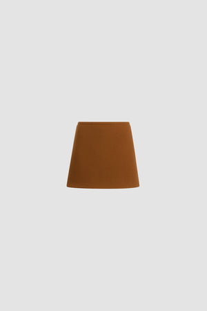 마호가니 컬러의 지속 가능한 울 혼방 스커트. 짧은 길이. 미드 웨이스트. A라인 실루엣. 뒷면의 지퍼 여밈. 뒷면의 다트 디테일. 안감 처리.
