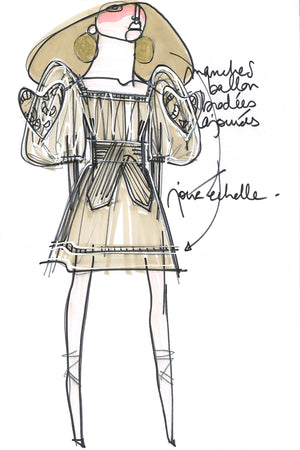 Ashes grey linen and cotton mini dress. Openwork detailing all over. Elasticated neckline that can be worn off the shoulders. Puffy sleeves with elasticated cuffs. Wide belt at the waist. Pockets at the sides.