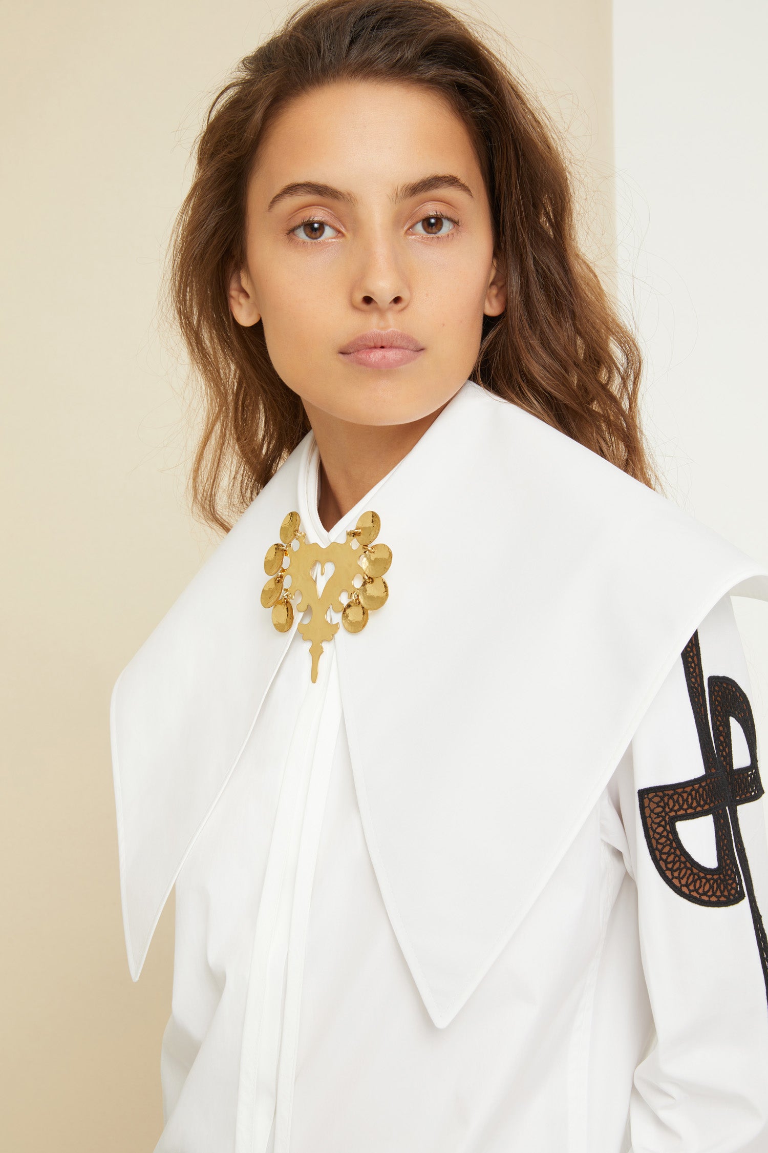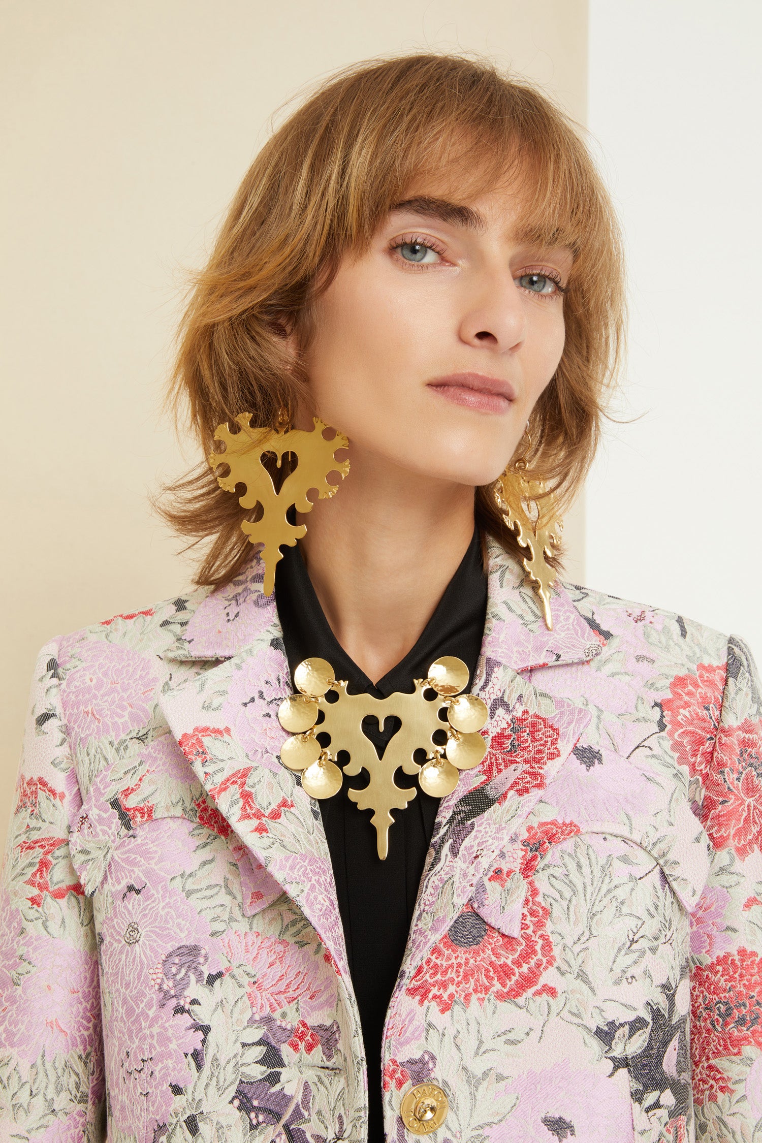 골드 컬러의 라지 브라스 브로치. 메탈 디스크로 둘러싼 프로방스 스타일 주얼리에서 영감을 받은 하트와 크로스 모티프 디자인.