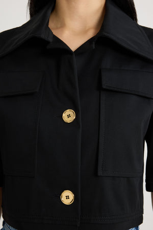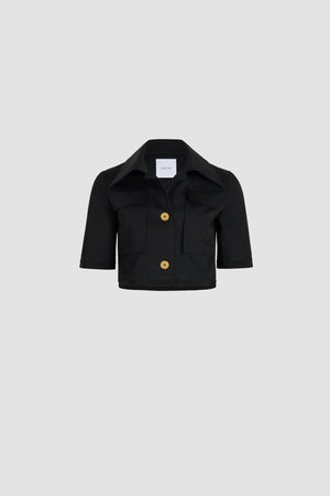 블랙 컬러 오가닉 코튼 개버딘 소재. 크롭 길이. 와이드 칼라. 골드톤 JP 인그레이빙 버튼. 가슴에 패치 포켓. 엘보 랭스 슬리브. 커프스 및 헴의 그로그랭 트리밍.
