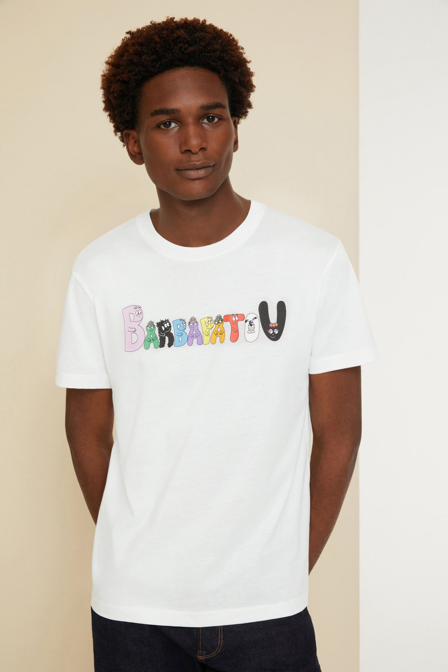 화이트 컬러의 오가닉 코튼 소재 티셔츠. Barbapapa와의 특별한 콜라보레이션으로 탄생한 Barbapatou 캡슐 컬렉션 아이템. 크루넥 디자인. 바바파파 패밀리 글자의 Barbapatou 프린트가 장식된 앞면. 뒷면의 바바파파 패밀리 글자로 재해석된 JP 모노그램.